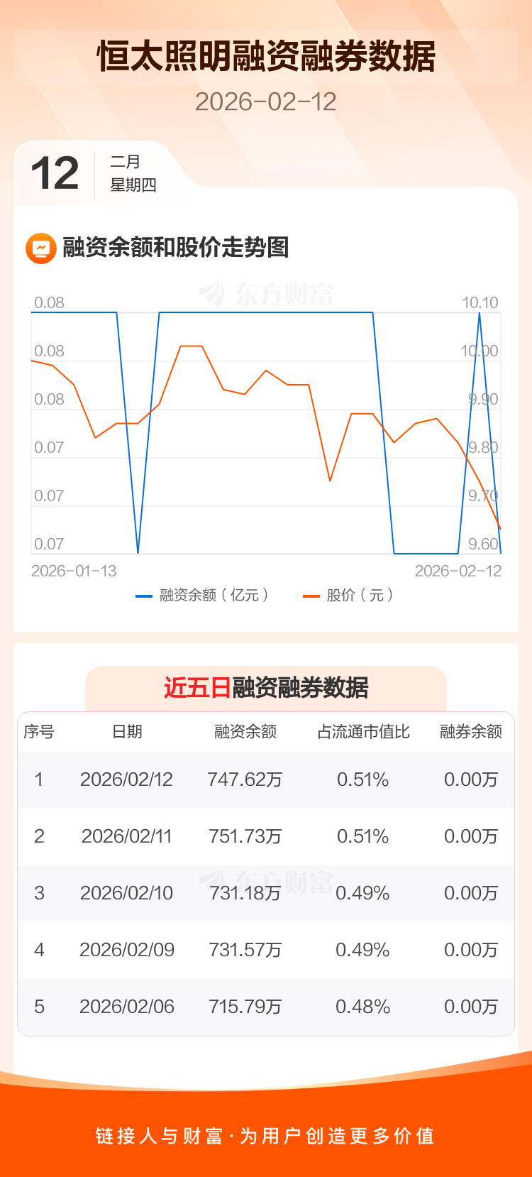 交易所最新数据显示,恒太照明于2026年2月12日获融资买入31.60万元,融资偿还35.71万元,当日融资净偿还4.11万元。目前,该股融资余额747.62万,占流通市值比例为0.51%。