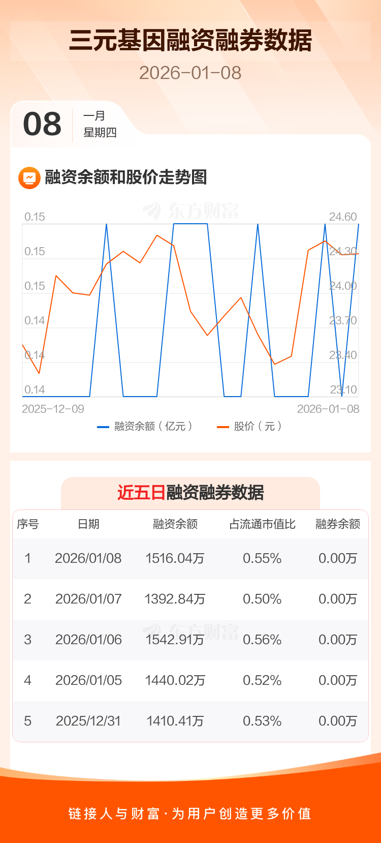 交易所最新数据显示,三元基因于2026年1月8日获融资买入201.80万元,融资偿还78.60万元,当日融资净买入123.2万元。目前,该股融资余额1516.04万,占流通市值比例为0.55%。