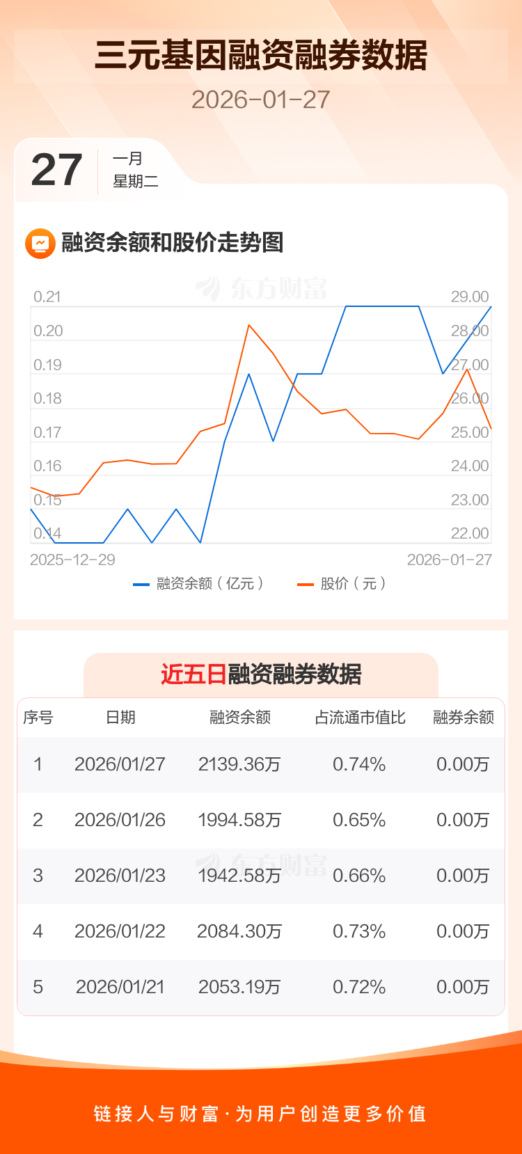 交易所最新数据显示,三元基因于2026年1月27日获融资买入495.54万元,融资偿还350.76万元,当日融资净买入144.78万元。目前,该股融资余额2139.36万,占流通市值比例为0.74%。