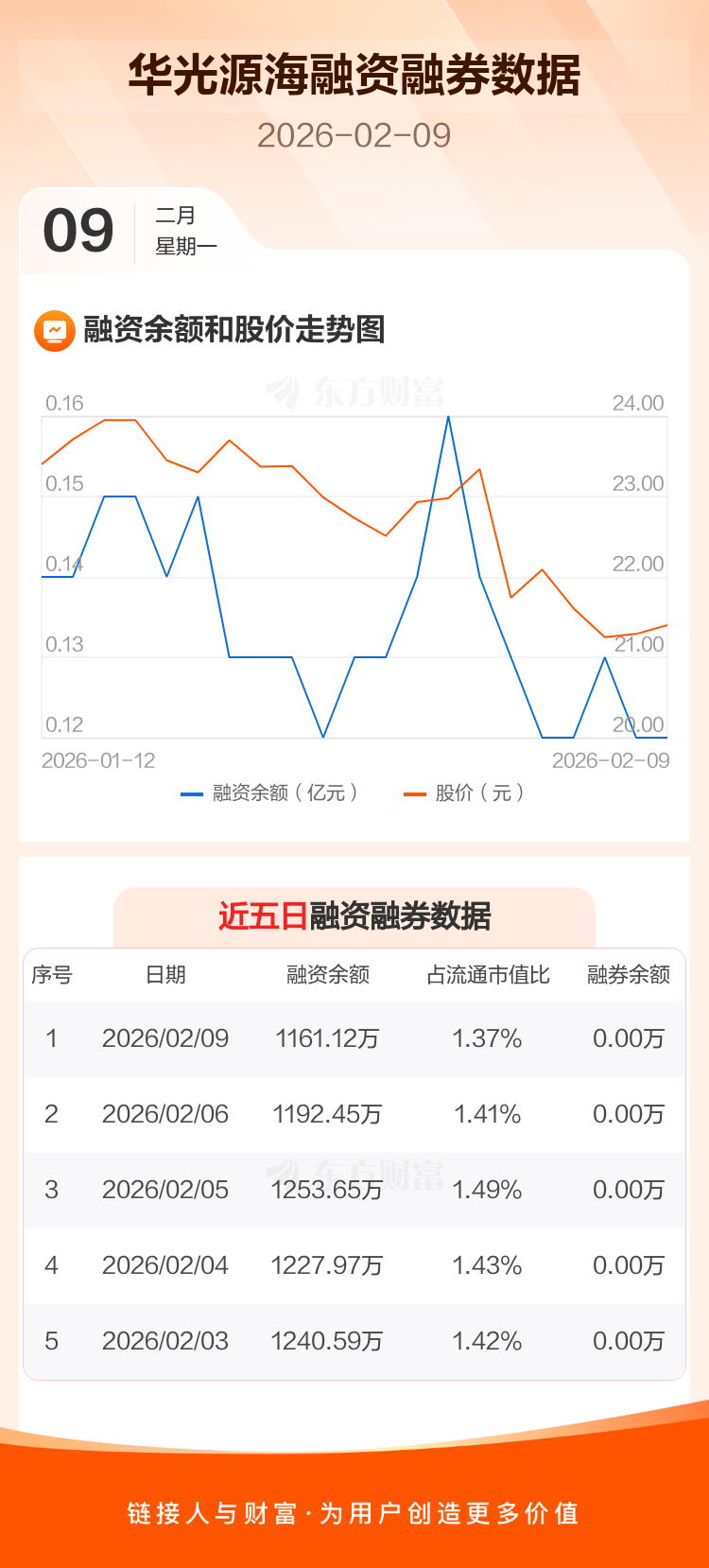 交易所最新数据显示,华光源海于2026年2月9日获融资买入6.07万元,融资偿还37.40万元,当日融资净偿还31.33万元。目前,该股融资余额1161.12万,占流通市值比例为1.37%。
