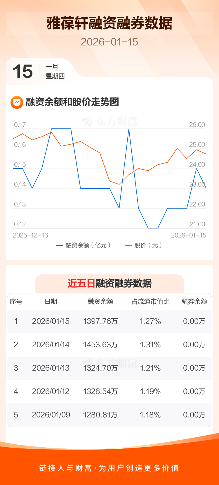 交易所最新数据显示,雅葆轩于2026年1月15日获融资买入126.85万元,融资偿还182.72万元,当日融资净偿还55.87万元。目前,该股融资余额1397.76万,占流通市值比例为1.27%。
