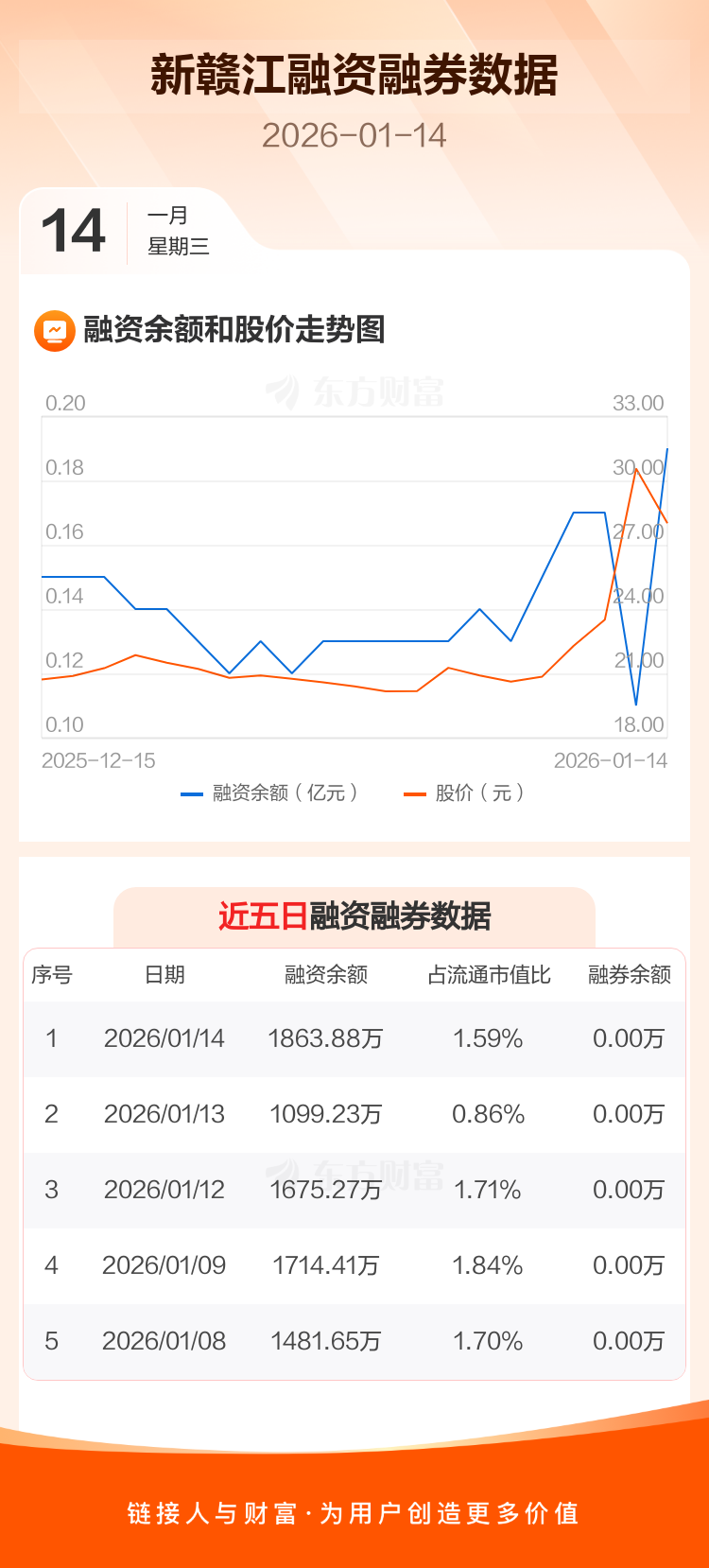 交易所最新数据显示,新赣江于2026年1月14日获融资买入1555.17万元,融资偿还790.53万元,当日融资净买入764.65万元。目前,该股融资余额1863.88万,占流通市值比例为1.59%。