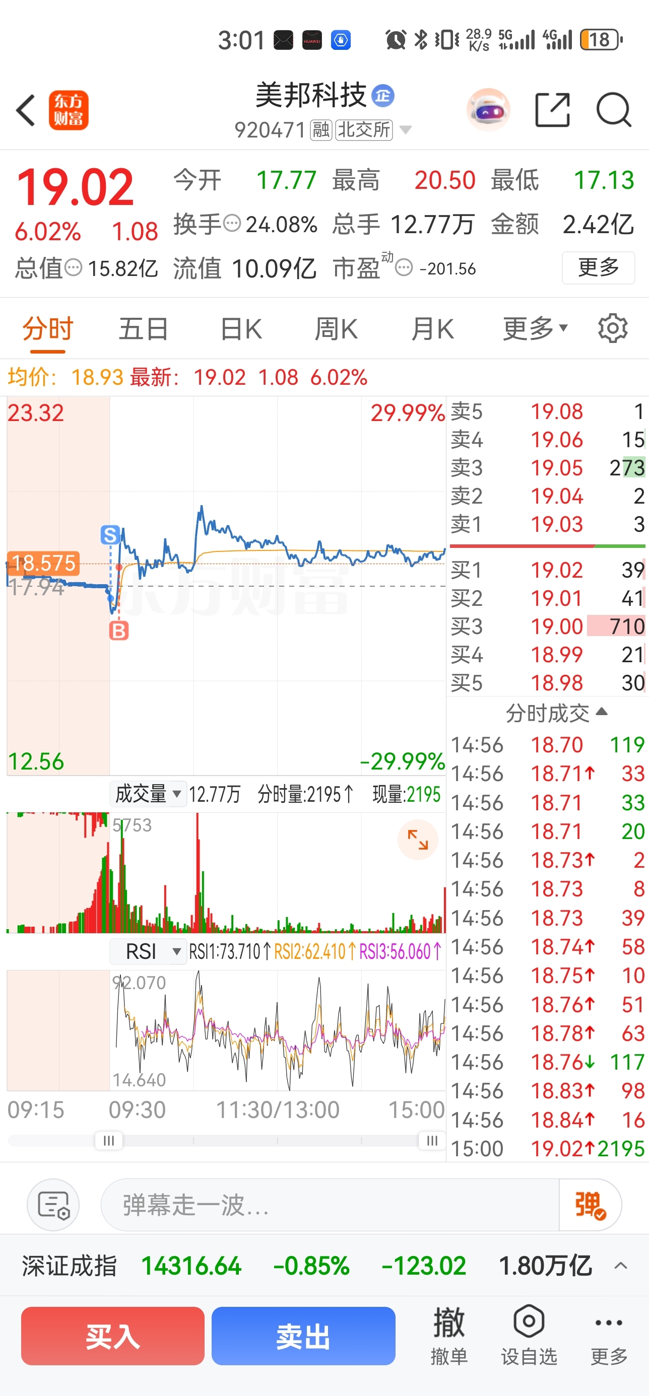 2、$美邦科技(SZ920471)$ 还算强势,早盘出来后发现还是他稳,做了个反T直接满仓,虽然没有吃面,也略有盈利2.4%,但今天真不应该这么激进,理智点五成仓顶天了,没吃面多少带点运气吧!明天注意控制仓位~