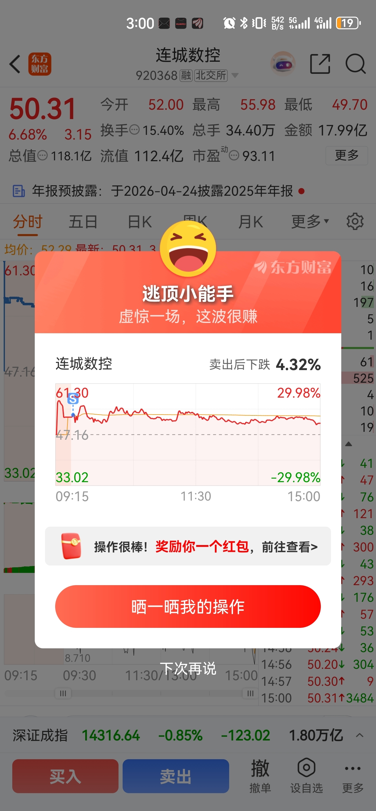 1、$连城数控(SZ920368)$ 就算今天涨停也不属于我了,两天33%盈利也知足了,不用纠结盘中他涨但18%还是20%,不重要,多次强调:北交所就是快进快出,不恋战,火中取栗的事,舍不得就会被烤熟!包括优机股份,周五2%盈利今天割肉,这只票三成仓亏3%,无所谓的事,抓大放小!像周五卖出的华维设计也是,没出的今天能舍得割肉的估计没几个吧?28%的大面,谁想尝尝就选择格局北交所