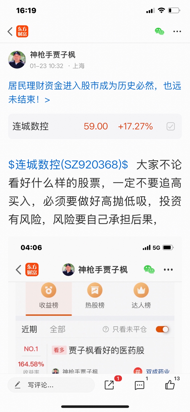$连城数控(SZ920368)$ 这个股我是一月二十三号发表文章看涨的股票,大家不要追高买入,必须要做好高抛低吸,我是不推荐股票的,大家不要跟我买卖股票,大家自己买什么样的股票是和我无关的,因为我是免费和大家一起交流股票,我是和大家一起学习的,我的观点仅供参考,投资有风险,风险要自己承担后果,