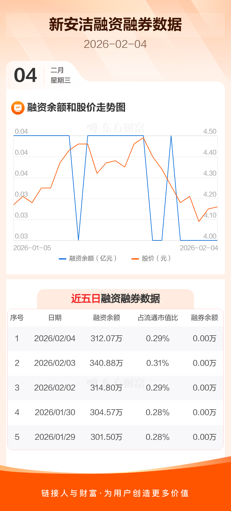 交易所最新数据显示,新安洁于2026年2月4日获融资买入47.69万元,融资偿还76.50万元,当日融资净偿还28.8万元。目前,该股融资余额312.07万,占流通市值比例为0.29%。