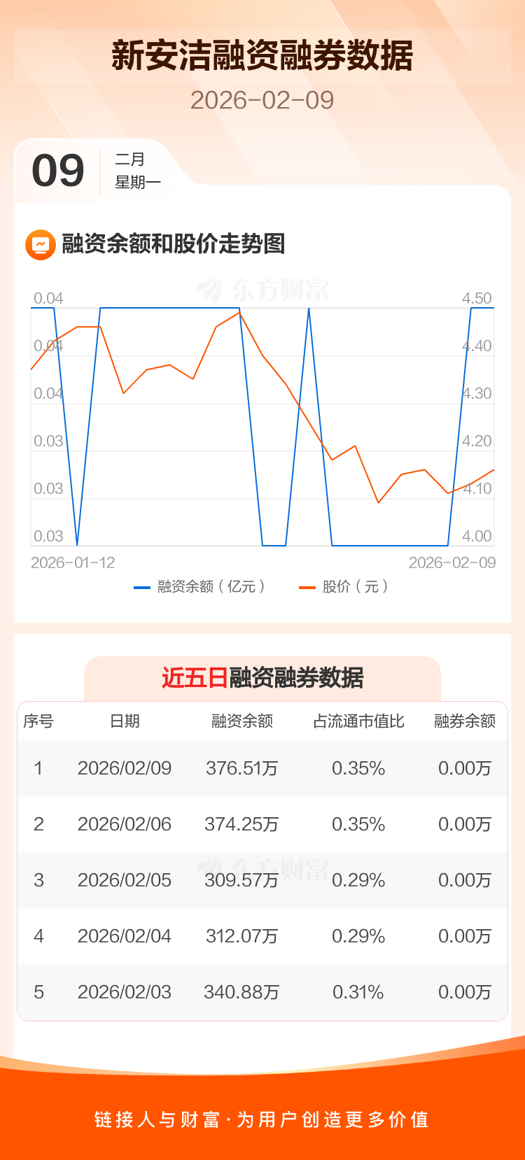 交易所最新数据显示,新安洁于2026年2月9日获融资买入26.08万元,融资偿还23.82万元,当日融资净买入2.27万元。目前,该股融资余额376.51万,占流通市值比例为0.35%。