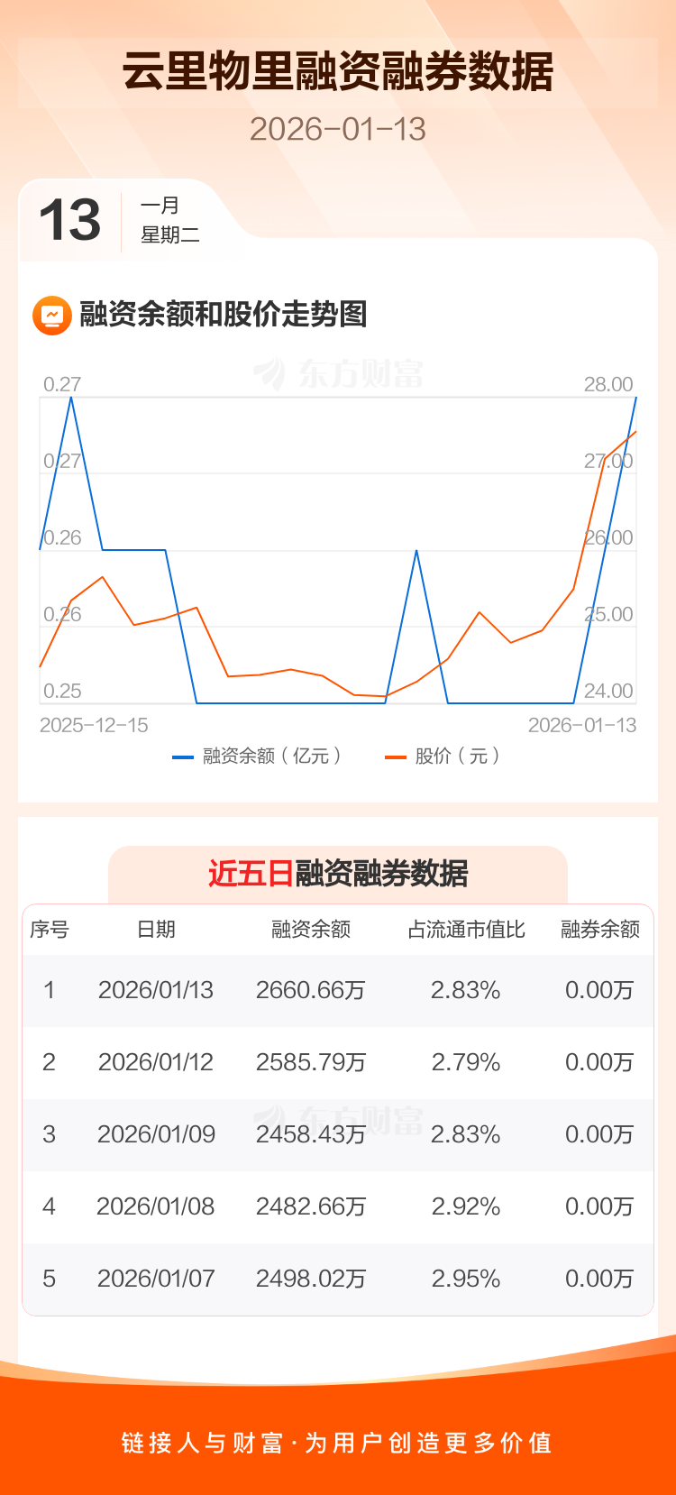 交易所最新数据显示,云里物里于2026年1月13日获融资买入273.22万元,融资偿还198.36万元,当日融资净买入74.87万元。目前,该股融资余额2660.66万,占流通市值比例为2.83%。