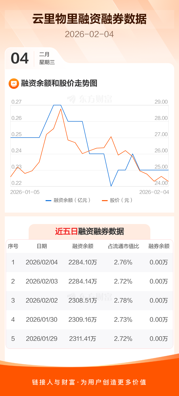 交易所最新数据显示,云里物里于2026年2月4日获融资买入11.66万元,融资偿还11.70万元,当日融资净偿还401元。目前,该股融资余额2284.10万,占流通市值比例为2.76%。