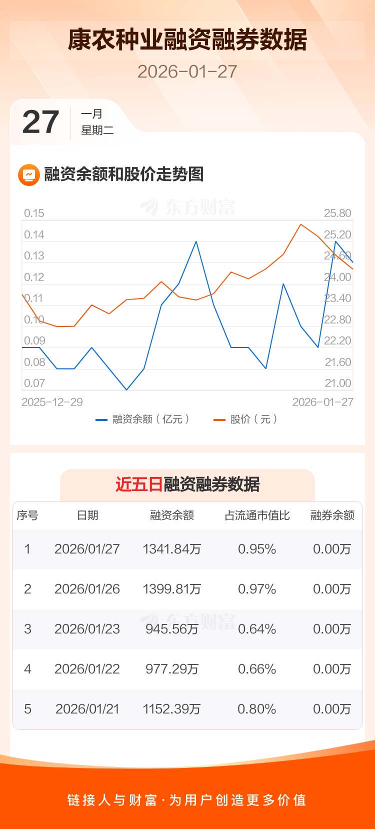 交易所最新数据显示,康农种业于2026年1月27日获融资买入89.82万元,融资偿还147.79万元,当日融资净偿还57.97万元。目前,该股融资余额1341.84万,占流通市值比例为0.95%。