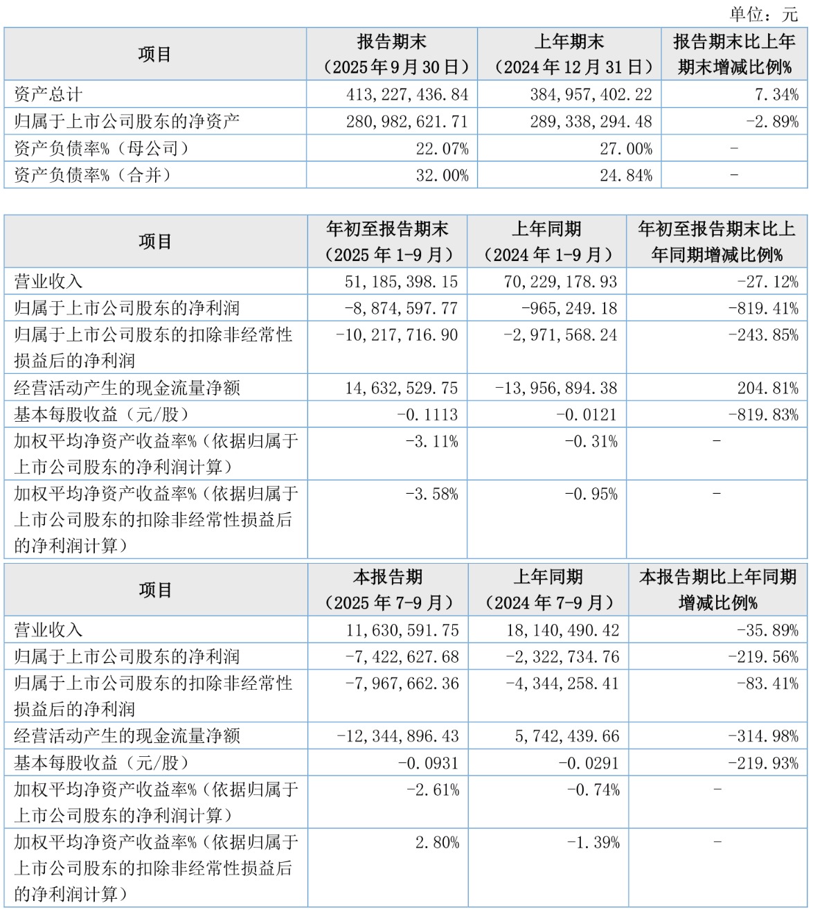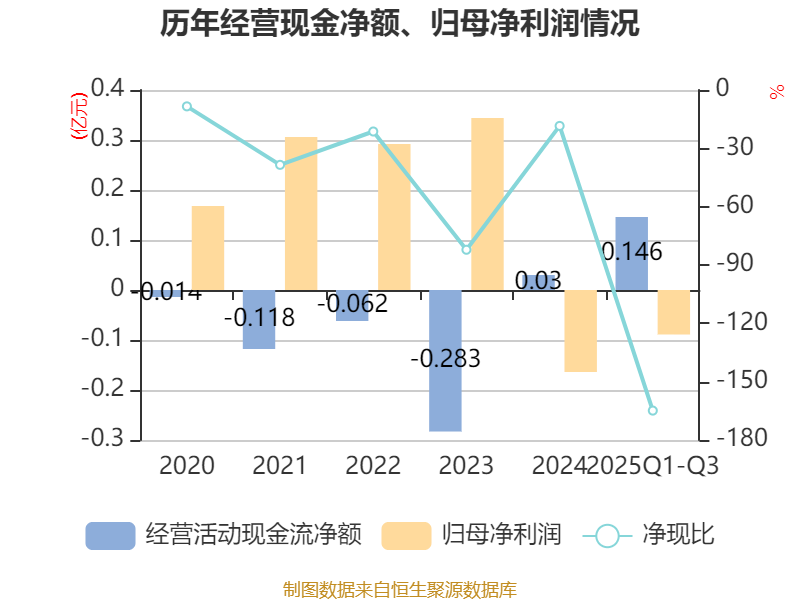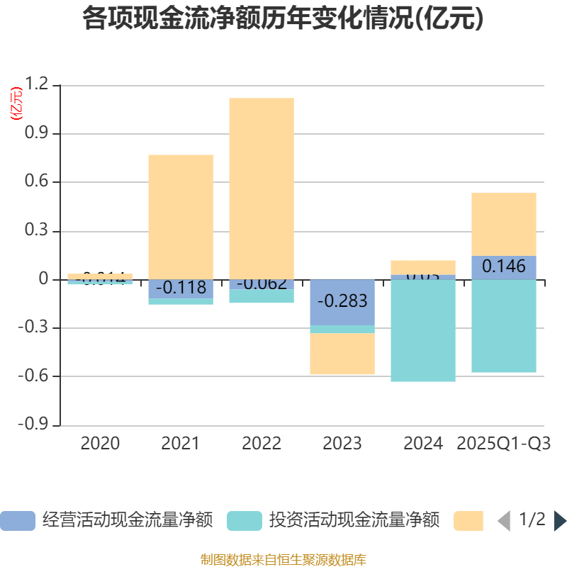 2025年前三季度,公司经营活动现金流净额为1463.25万元,同比增加2858.94万元;筹资活动现金流净额3889.89万元,同比增加3440.59万元;投资活动现金流净额-5737.01万元,上年同期为-2981.96万元。