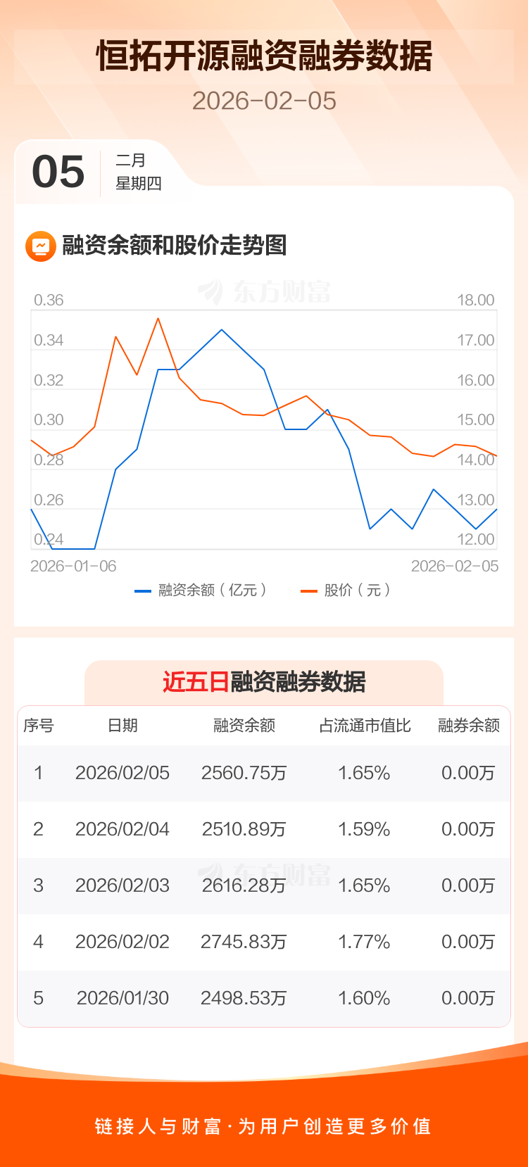 交易所最新数据显示,恒拓开源于2026年2月5日获融资买入69.16万元,融资偿还19.30万元,当日融资净买入49.86万元。目前,该股融资余额2560.75万,占流通市值比例为1.65%。