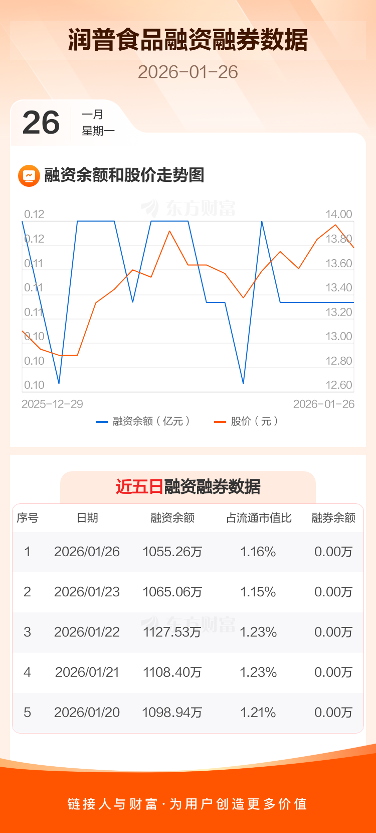 交易所最新数据显示,润普食品于2026年1月26日获融资买入133.46万元,融资偿还143.25万元,当日融资净偿还9.79万元。目前,该股融资余额1055.26万,占流通市值比例为1.16%。
