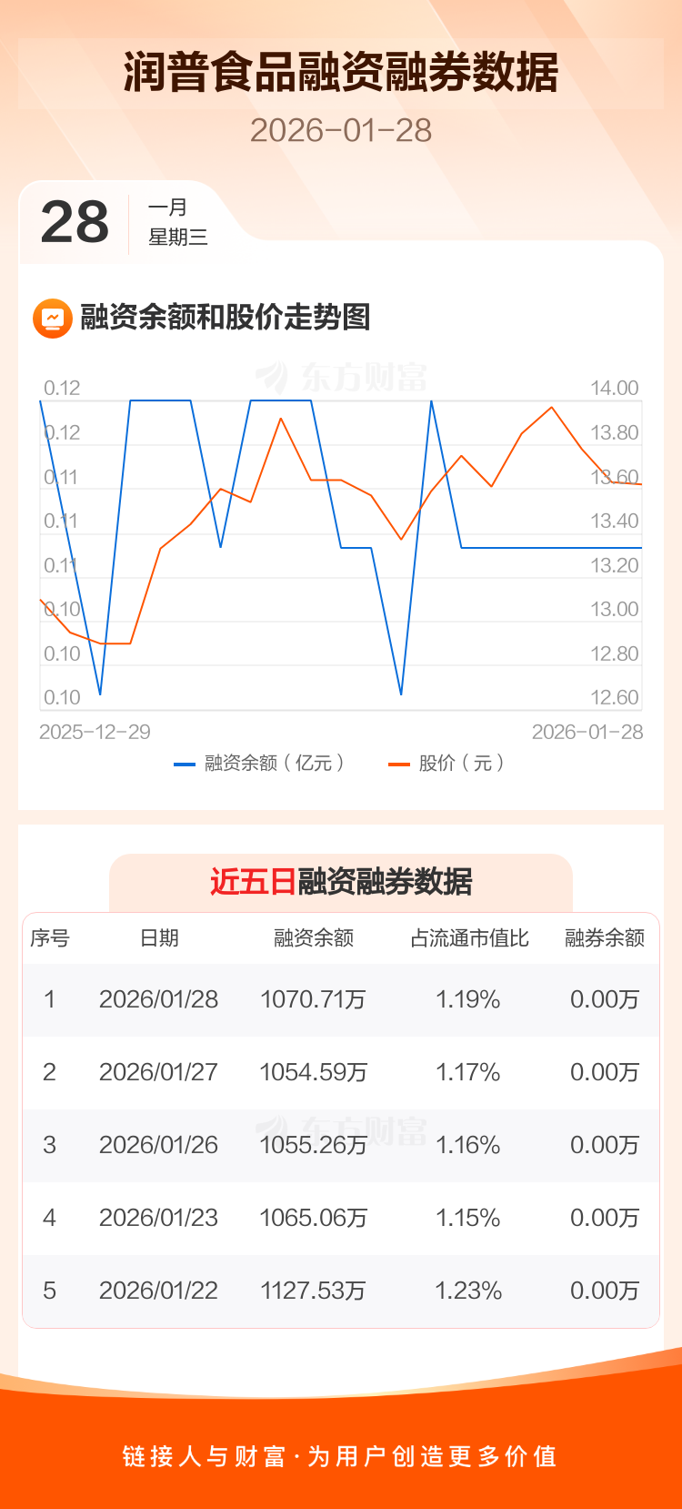 交易所最新数据显示,润普食品于2026年1月28日获融资买入139.13万元,融资偿还123.01万元,当日融资净买入16.12万元。目前,该股融资余额1070.71万,占流通市值比例为1.19%。