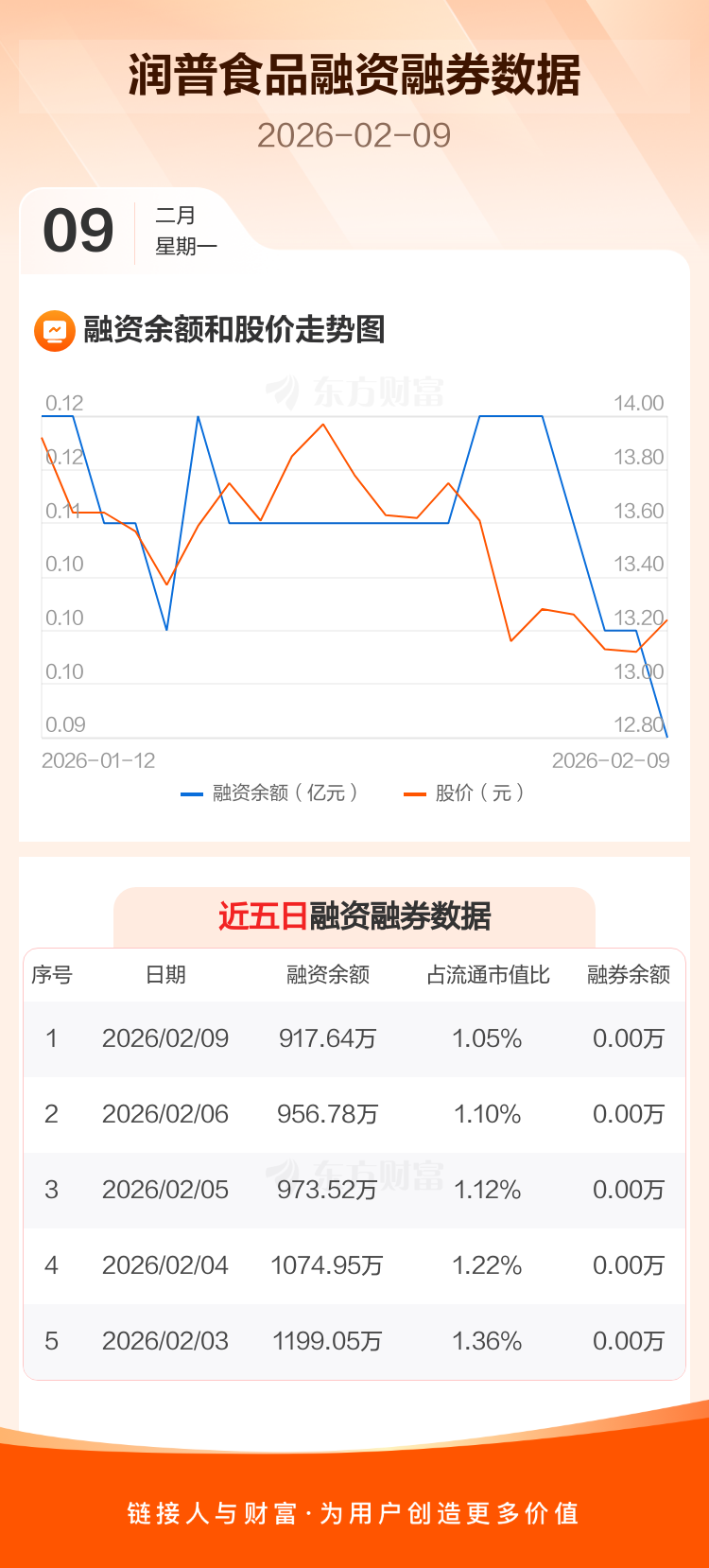 交易所最新数据显示,润普食品于2026年2月9日获融资买入25.81万元,融资偿还64.95万元,当日融资净偿还39.15万元。目前,该股融资余额917.64万,占流通市值比例为1.05%。