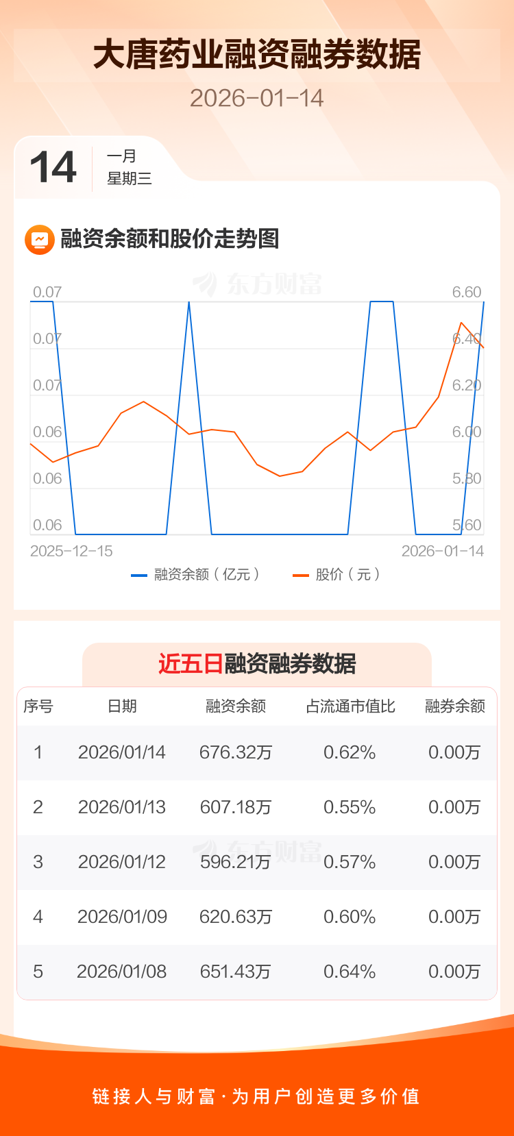 交易所最新数据显示,大唐药业于2026年1月14日获融资买入187.79万元,融资偿还118.65万元,当日融资净买入69.14万元。目前,该股融资余额676.32万,占流通市值比例为0.62%。