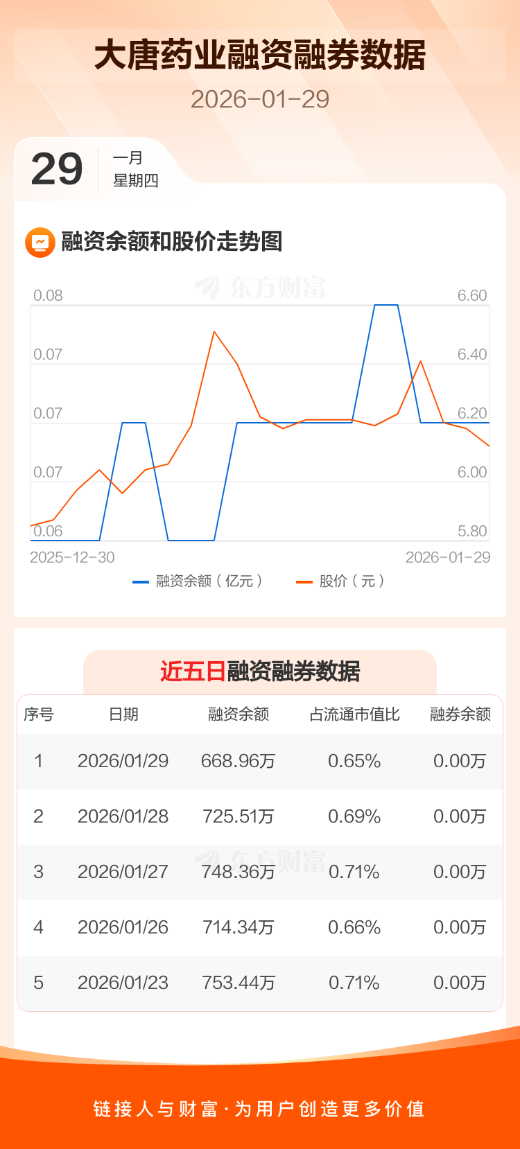 交易所最新数据显示,大唐药业于2026年1月29日获融资买入9.96万元,融资偿还66.52万元,当日融资净偿还56.56万元。目前,该股融资余额668.96万,占流通市值比例为0.65%。