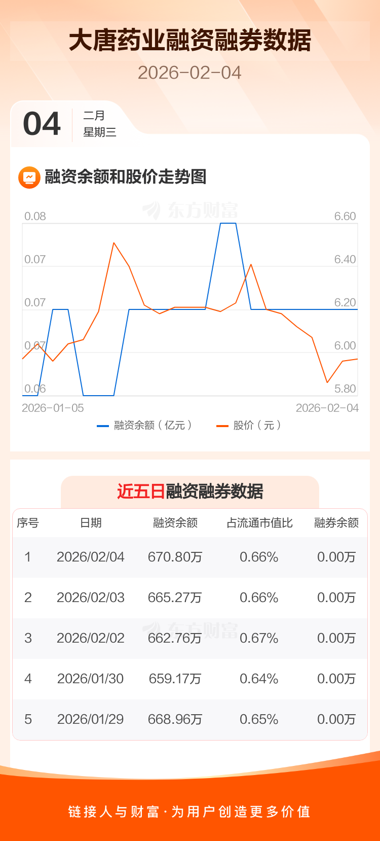 交易所最新数据显示,大唐药业于2026年2月4日获融资买入29.38万元,融资偿还23.86万元,当日融资净买入5.53万元。目前,该股融资余额670.80万,占流通市值比例为0.66%。