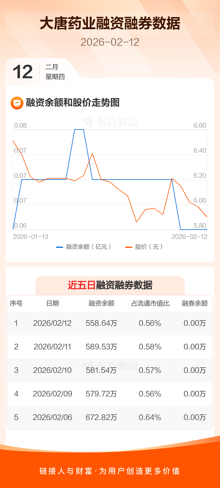 交易所最新数据显示,大唐药业于2026年2月12日获融资买入17.25万元,融资偿还48.14万元,当日融资净偿还30.89万元。目前,该股融资余额558.64万,占流通市值比例为0.56%。