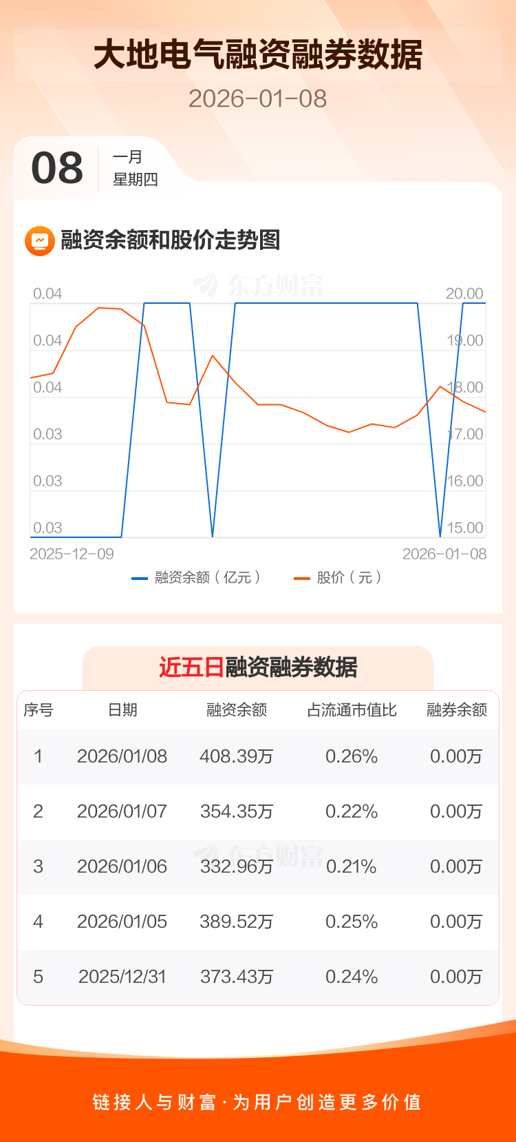 交易所最新数据显示,大地电气于2026年1月8日获融资买入92.37万元,融资偿还38.33万元,当日融资净买入54.04万元。目前,该股融资余额408.39万,占流通市值比例为0.26%。