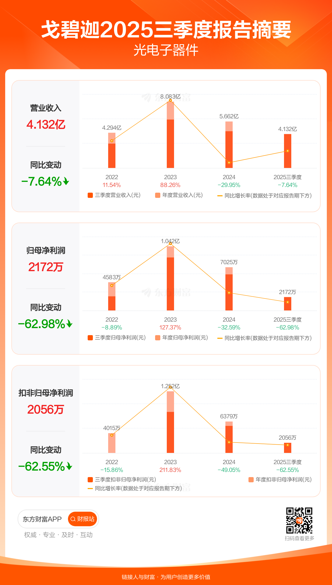 戈碧迦10月27日发布2025年三季报显示,公司前三季实现营业收入4.13亿元,同比下滑7.64%;归母净利润2172.15万元,同比下滑62.98%;扣非归母净利润2056.31万元,同比下滑62.55%。