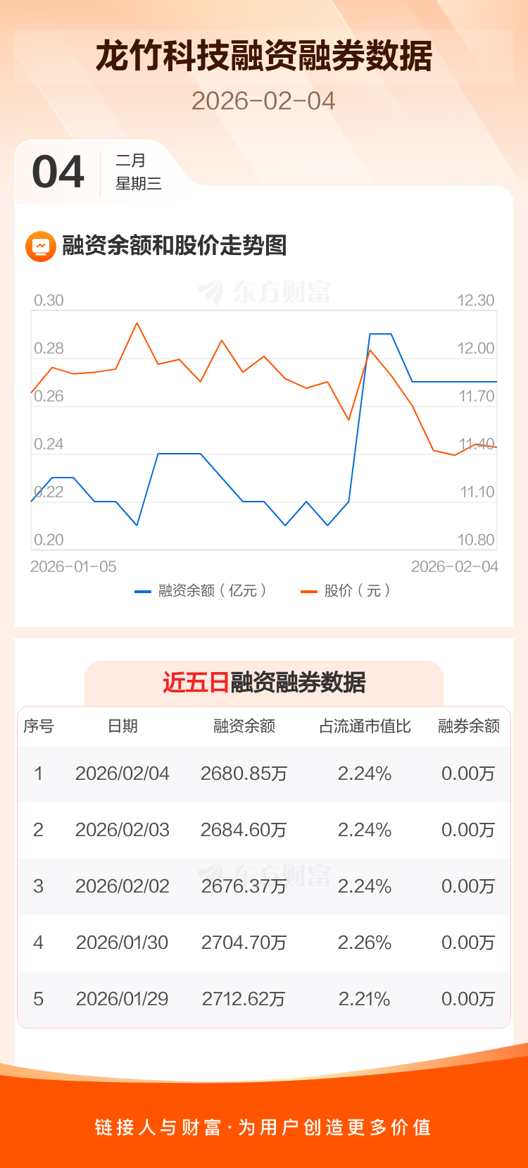 交易所最新数据显示,龙竹科技于2026年2月4日获融资买入53.37万元,融资偿还57.12万元,当日融资净偿还3.75万元。目前,该股融资余额2680.85万,占流通市值比例为2.24%。