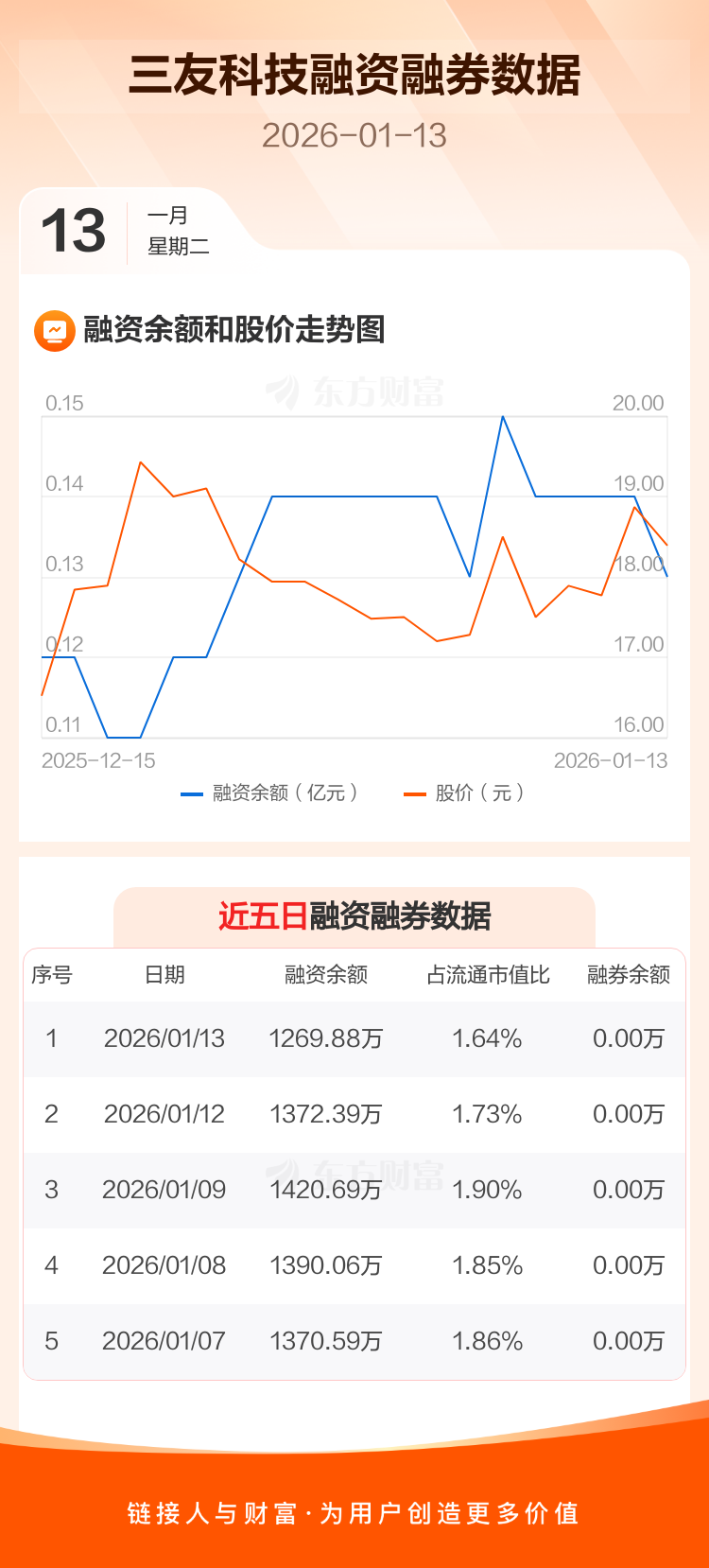 交易所最新数据显示,三友科技于2026年1月13日获融资买入104.82万元,融资偿还207.33万元,当日融资净偿还102.51万元。目前,该股融资余额1269.88万,占流通市值比例为1.64%。