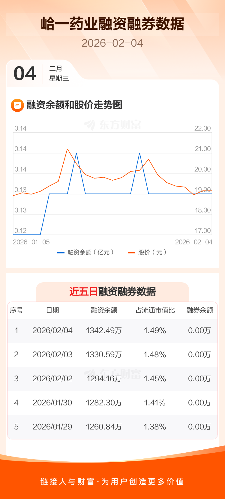 交易所最新数据显示,峆一药业于2026年2月4日获融资买入124.78万元,融资偿还112.89万元,当日融资净买入11.89万元。目前,该股融资余额1342.49万,占流通市值比例为1.49%。