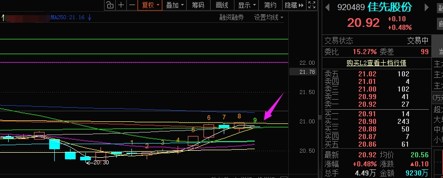 2:佳先15分钟突破并站稳黄线后才行(粉色箭头处),否则的话还会回踩一下。发帖时发现已突破