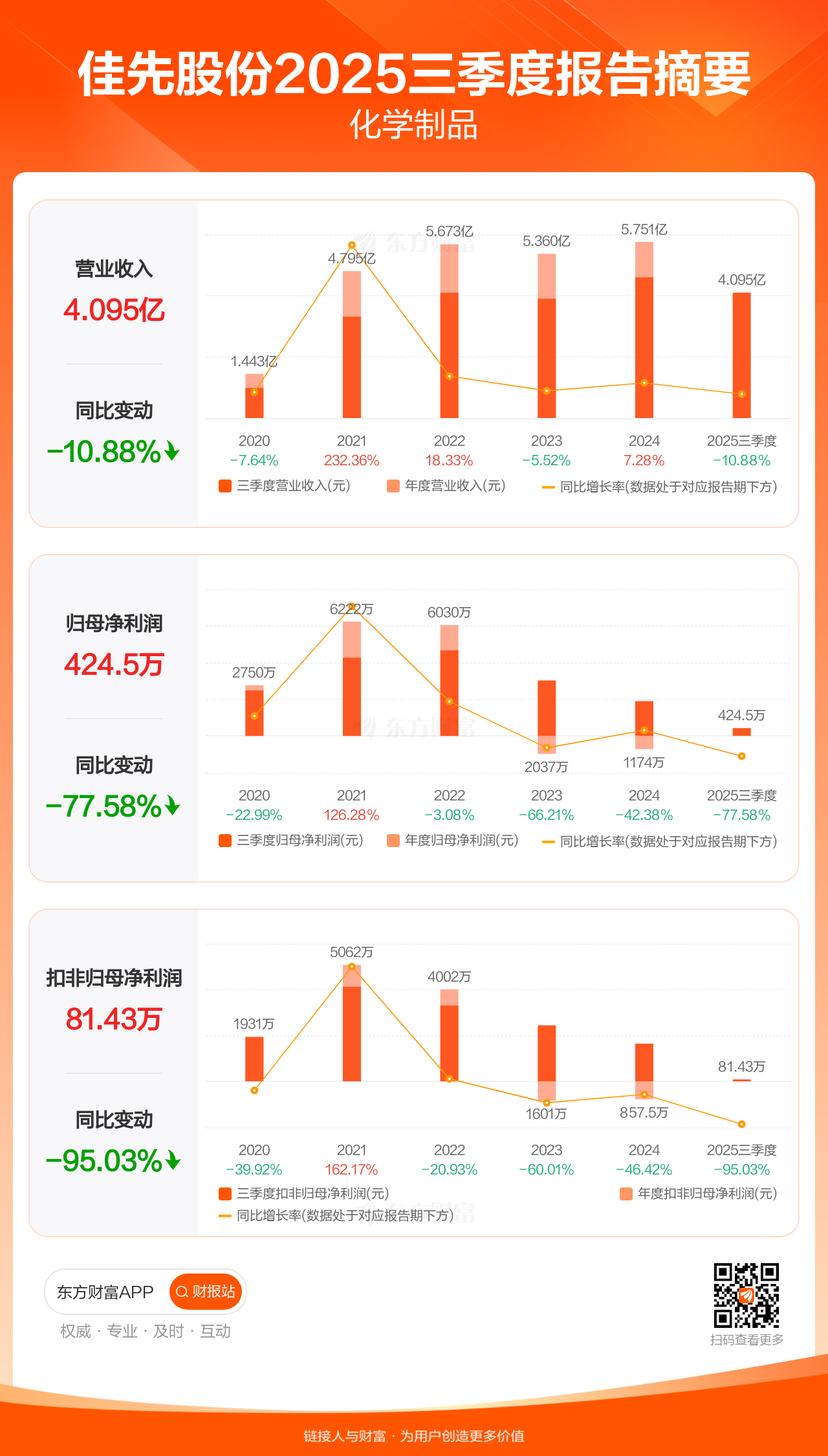 佳先股份10月30日发布2025年三季报显示,公司前三季实现营业收入4.09亿元,同比下滑10.88%;归母净利润424.51万元,同比下滑77.58%;扣非归母净利润81.43万元,同比下滑95.03%。