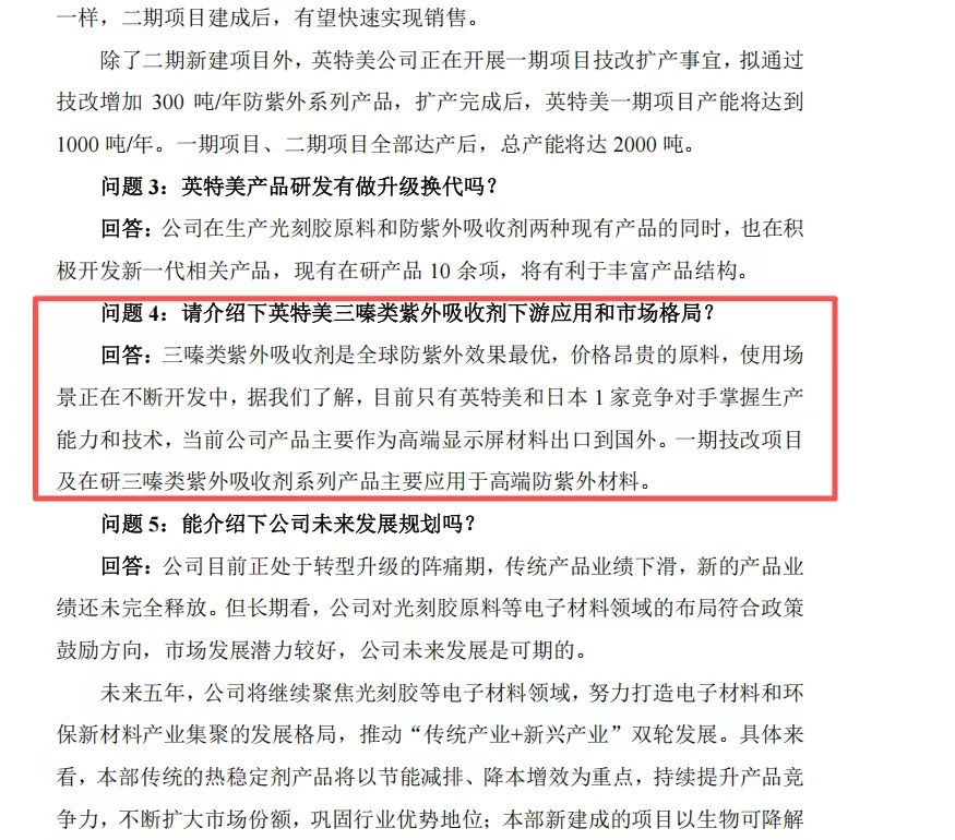 据我们了解,目前只有英特美和日本1家竞争对手掌握生产能力和技术,当前公司产品主要作为高端显示屏材料出口到国外。一期技改项目及在研三嗪类紫外吸收剂系列产品主要应用于高端防紫外材料。