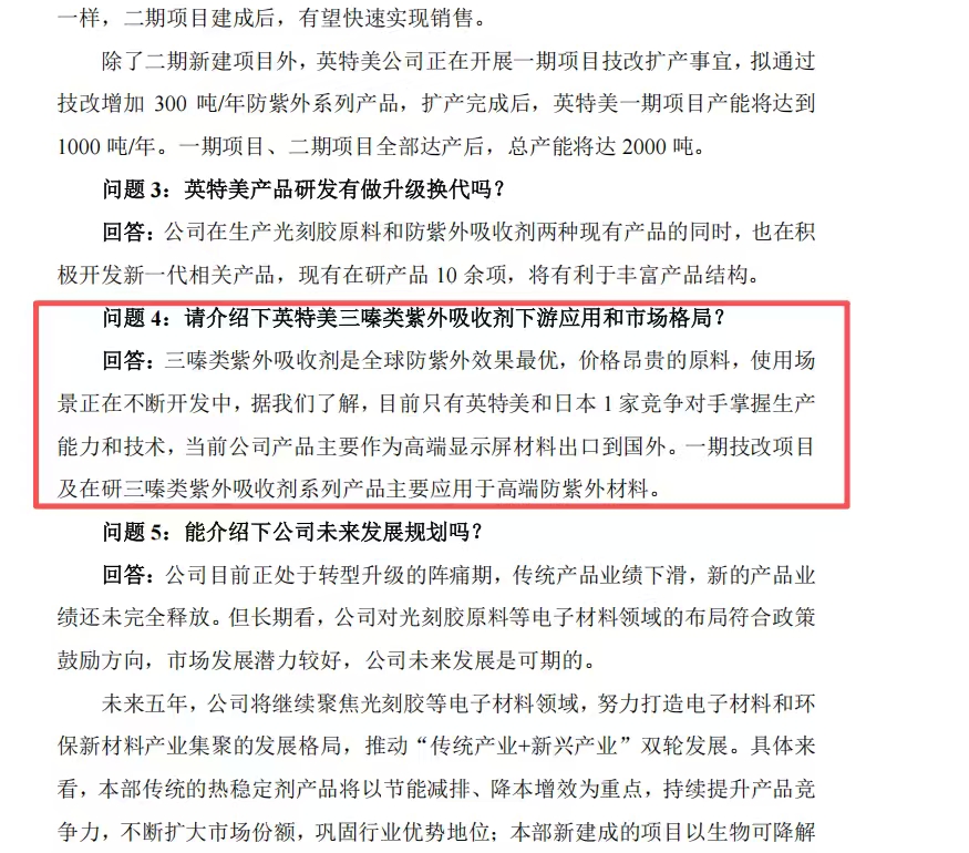 佳先股份,英特美高端光刻胶。三嗪类紫外吸收剂是全球防紫外效果最优,价格昂贵的原料