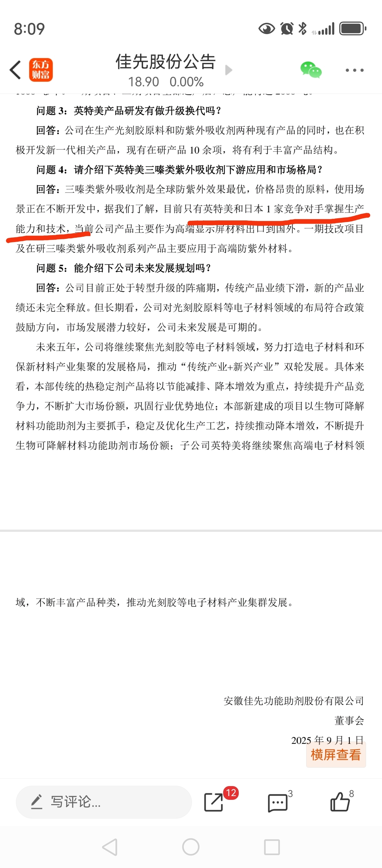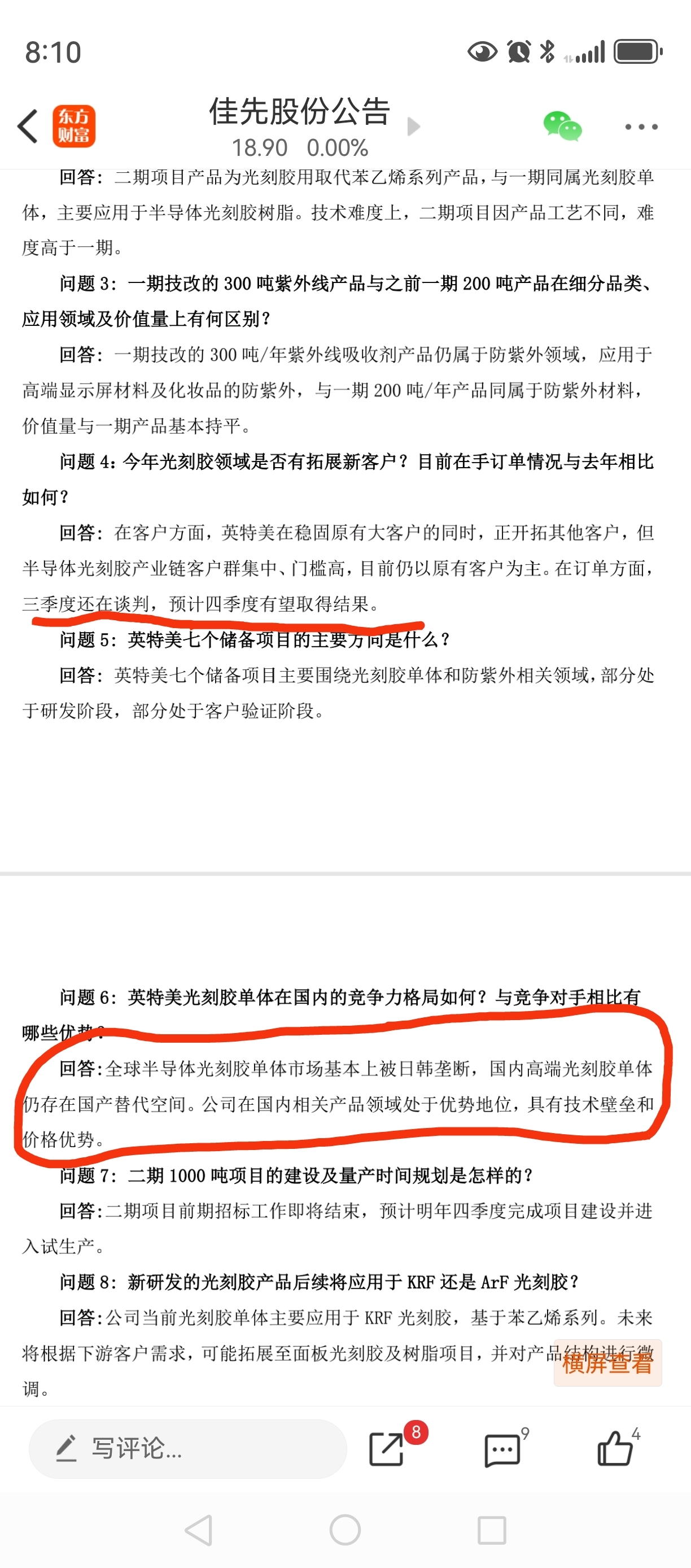 佳先股份在9月初的投资者会议上,说了,公司的高端光刻胶单体,技术处于优势地位,具