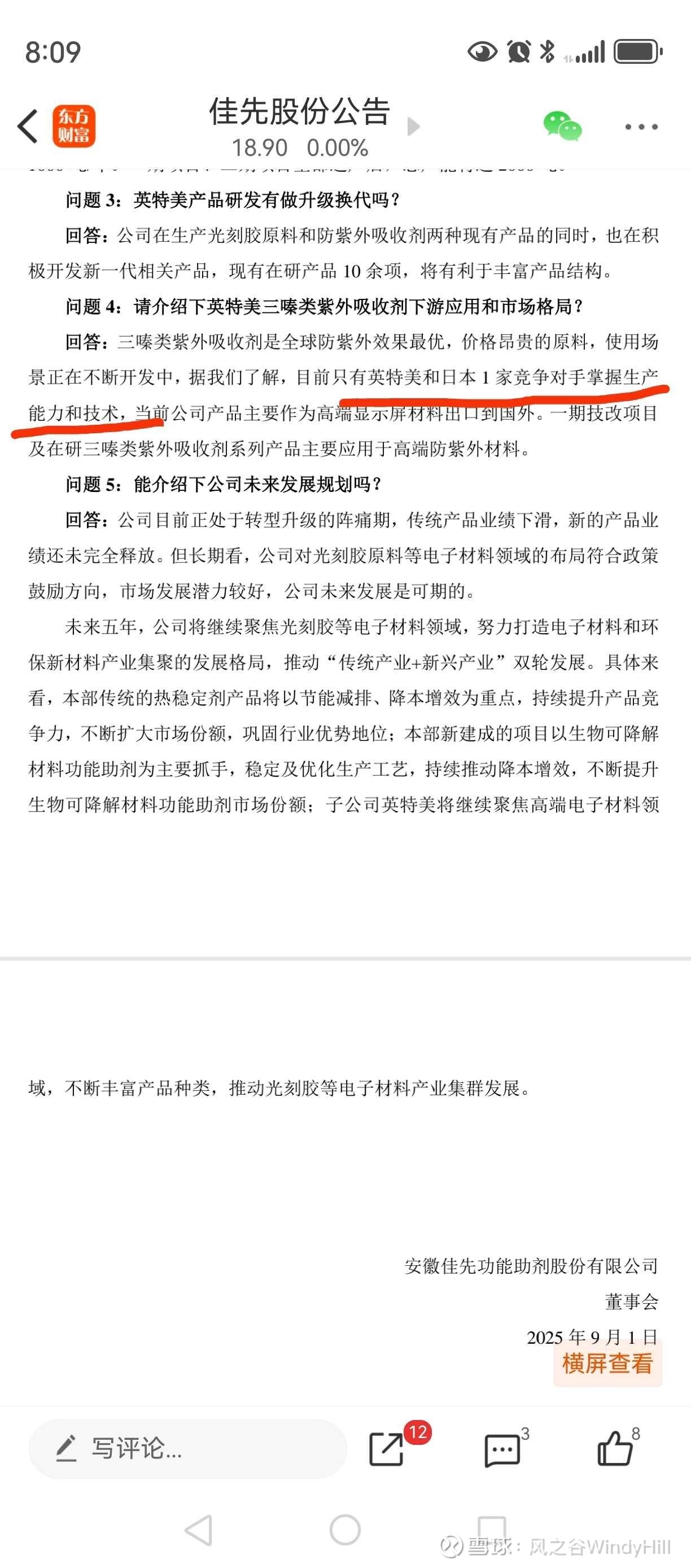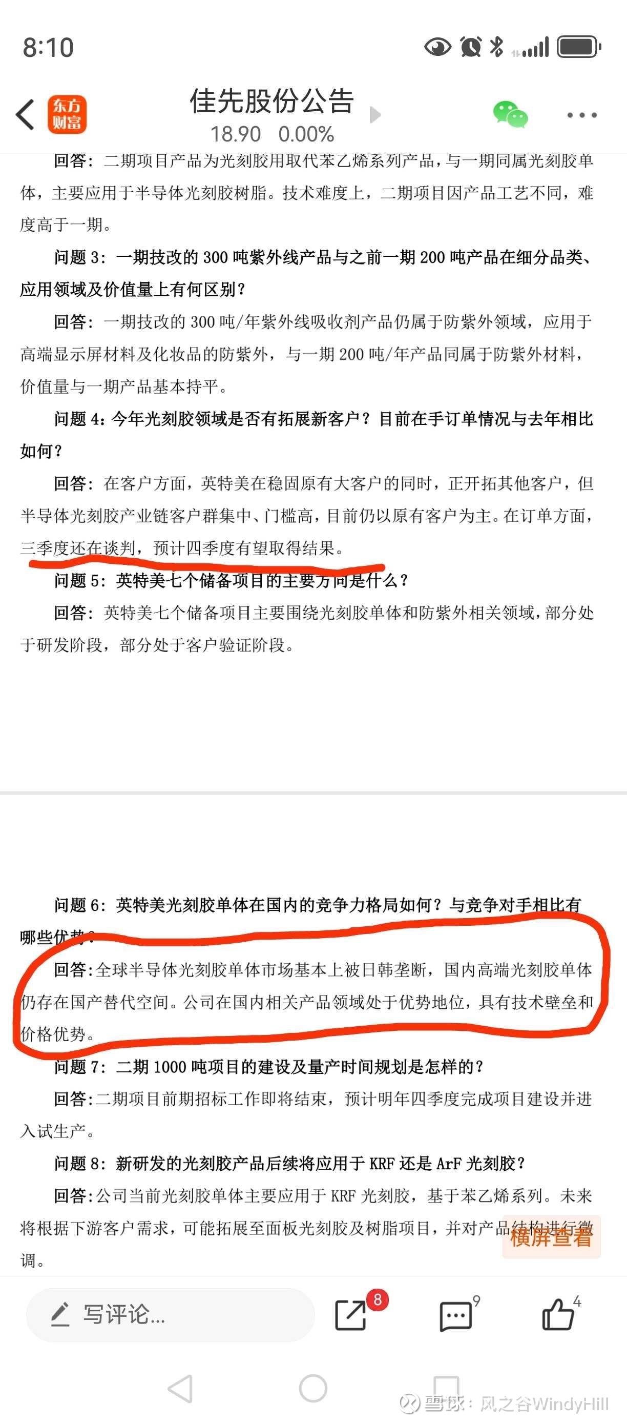 佳先股份在9月初的投资者会议上,说了,公司的高端光刻胶单体,技术处于优势地位,具有技术壁垒和价格优势,国产替代空间很大,12月份会公布光刻胶的最新订单。