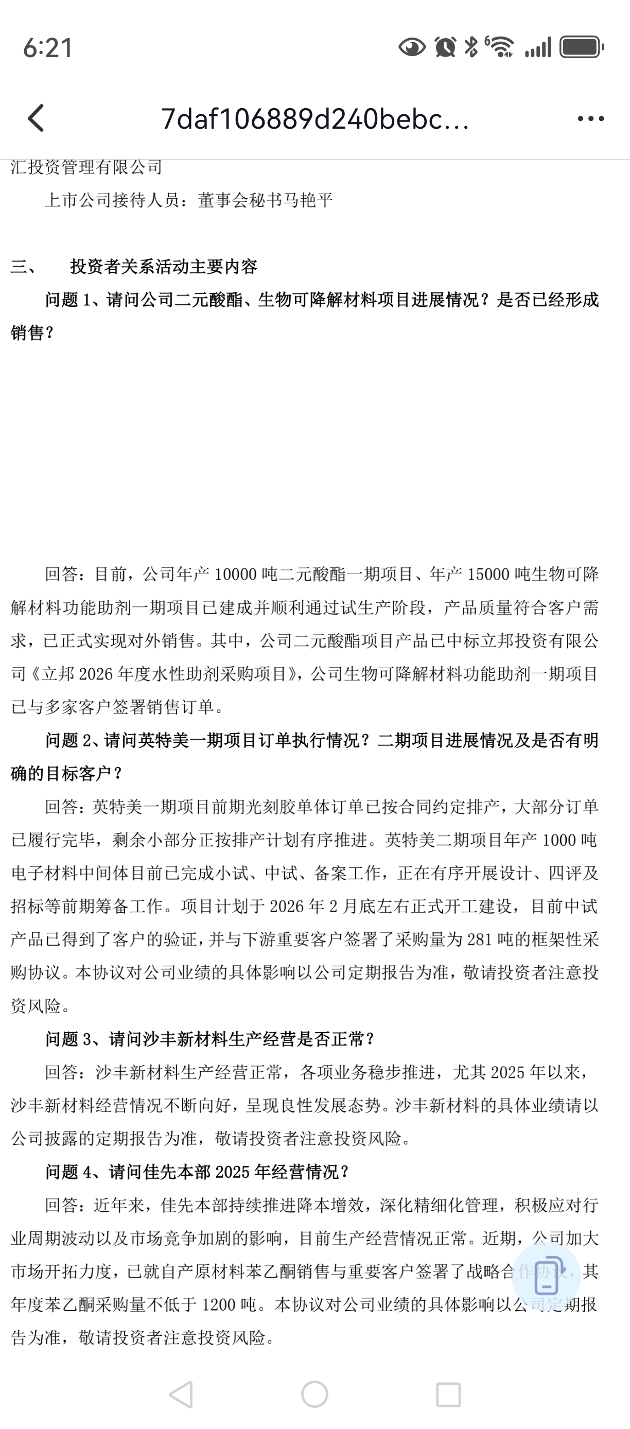 $佳先股份(SZ920489)$ 公司最新公告,目前,公司年产10000吨二元酸酯一期项目、年产 15000 吨生物可降解材料功能助剂一期项目已建成并顺利通过试生产阶段,产品质量符合客户需求,已正式实现对外销售。其中,公司二元酸酯项目产品已中标立邦投资有限公司《立邦2026年度水性助剂采购项目》,公司生物可降解材料功能助剂一期项目已与多家客户签署销售订单。