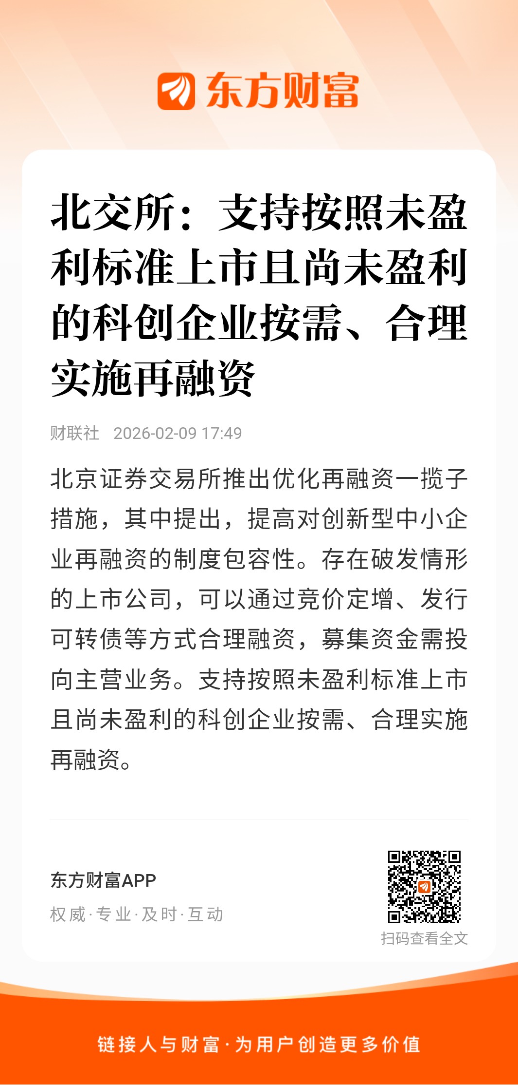 北京证券交易所推出优化再融资一揽子措施,其中提出,提高对创新型中小企业再融资的制度包容性。存在破发情形的上市公司,可以通过竞价定增、发行可转债等方式合理融资,募集资金需投向主营业务。支持按照未盈利标准上市且尚未盈利的科创企业按需、合理实施再融资。