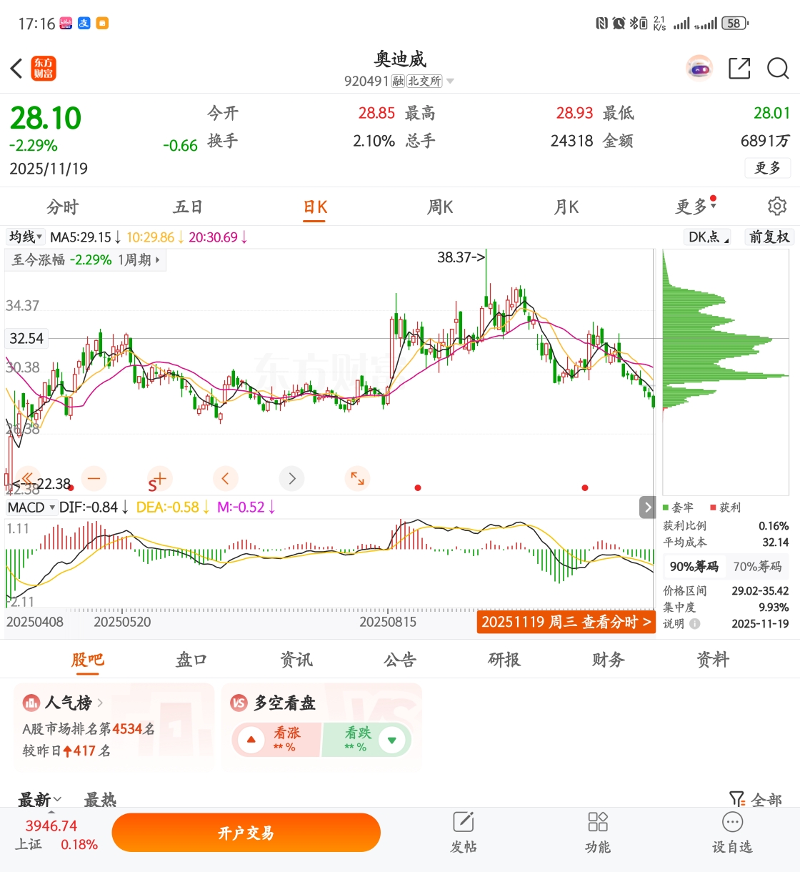 $奥迪威(SZ920491)$ 今天集中度都快到10%了,哈哈,好多人割肉。我的盛宴。