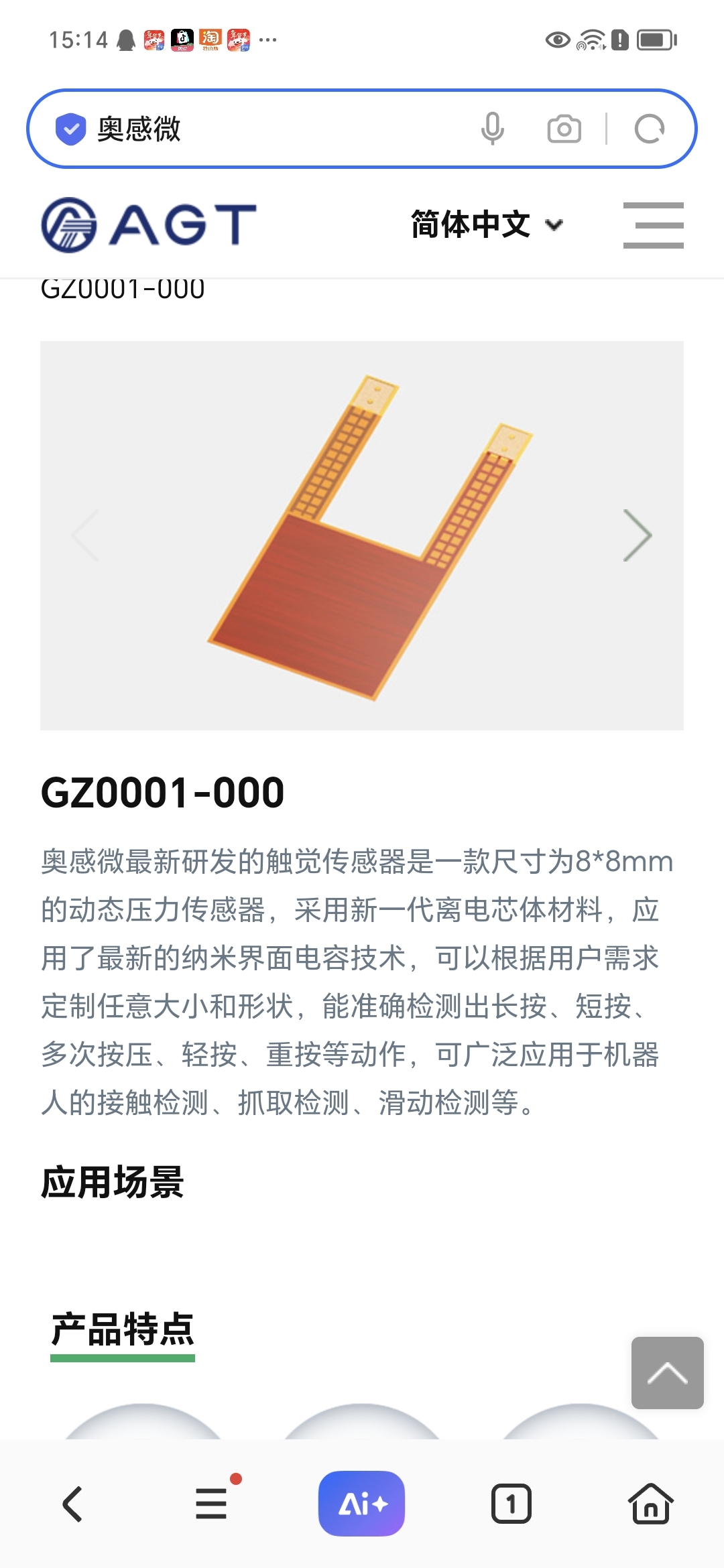 奥感微最新研发的触觉传感器是一款尺寸为8*8mm的动态压力传感器,采用新一代离电芯体材料,应用了最新的纳米界面电容技术,可以根据用户需求定制任意大小和形状,能准确检测出长按、短按、多次按压、轻按、重按等动作,可广泛应用于机器人的接触检测、抓取检测、滑动检测等