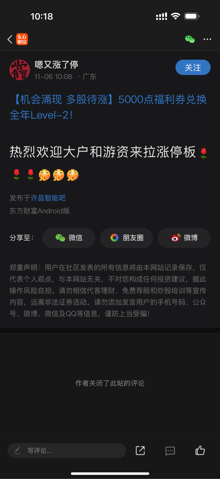 温馨提示: 1.根据《证券法》规定,禁止编造、传播虚假信息或者误导性信息,扰乱证券市场;2.用户在本社区发表的所有资料、言论等仅代表个人观点,与本网站立场无关,不对您构成任何投资建议。用户应基于自己的独立判断,自行决定证券投资并承担相应风险。《东方财富社区管理规定》