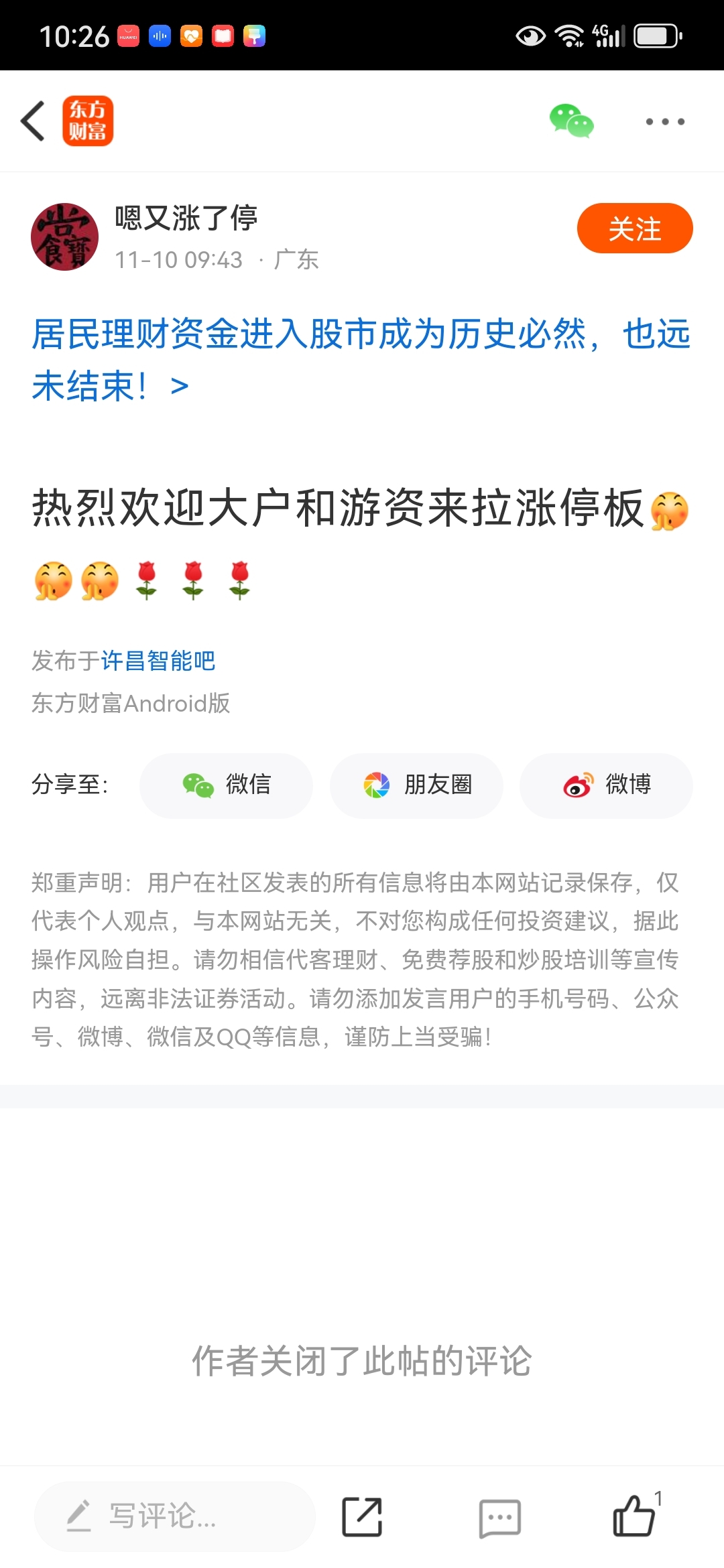 温馨提示: 1.根据《证券法》规定,禁止编造、传播虚假信息或者误导性信息,扰乱证券市场;2.用户在本社区发表的所有资料、言论等仅代表个人观点,与本网站立场无关,不对您构成任何投资建议。用户应基于自己的独立判断,自行决定证券投资并承担相应风险。《东方财富社区管理规定》