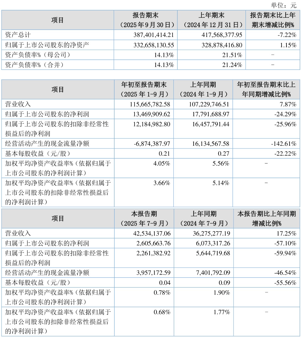 2025年前三季度,公司流动比率为4.66,速动比率为3.57。