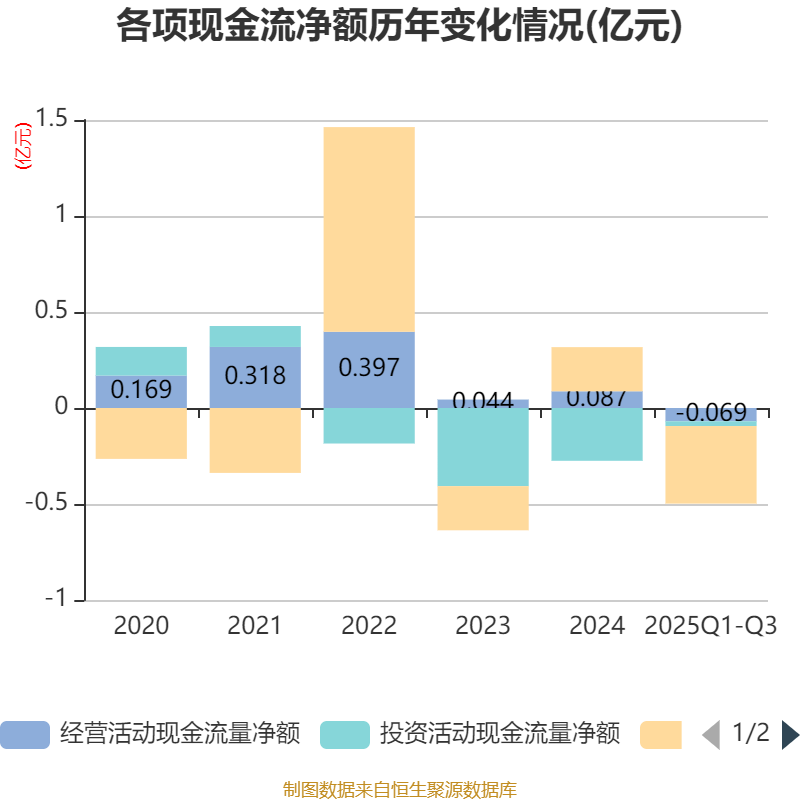 2025年前三季度,公司经营活动现金流净额为-687.44万元,同比减少2300.9万元;筹资活动现金流净额-4036.17万元,同比减少6367.88万元;投资活动现金流净额-254.95万元,上年同期为-7474.89万元。