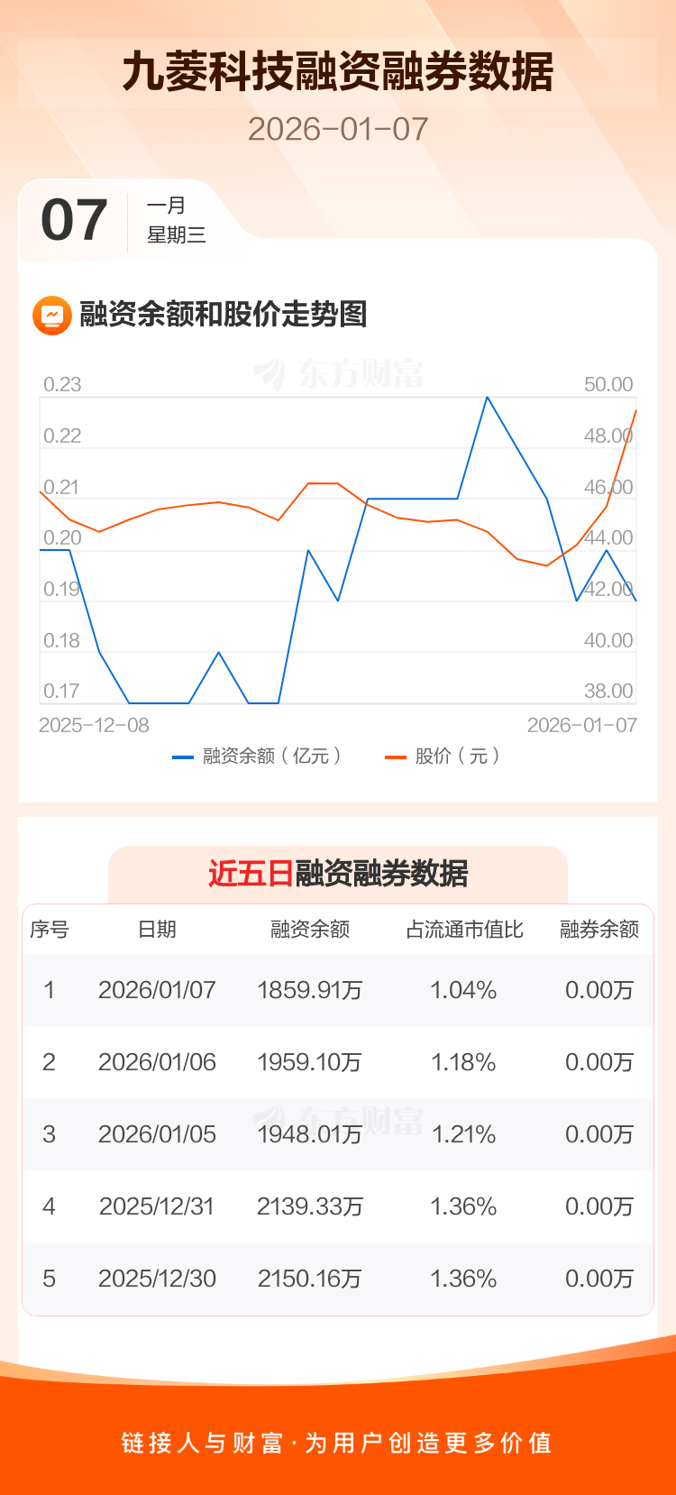 交易所最新数据显示,九菱科技于2026年1月7日获融资买入1011.08万元,融资偿还1110.27万元,当日融资净偿还99.18万元。目前,该股融资余额1859.91万,占流通市值比例为1.04%。