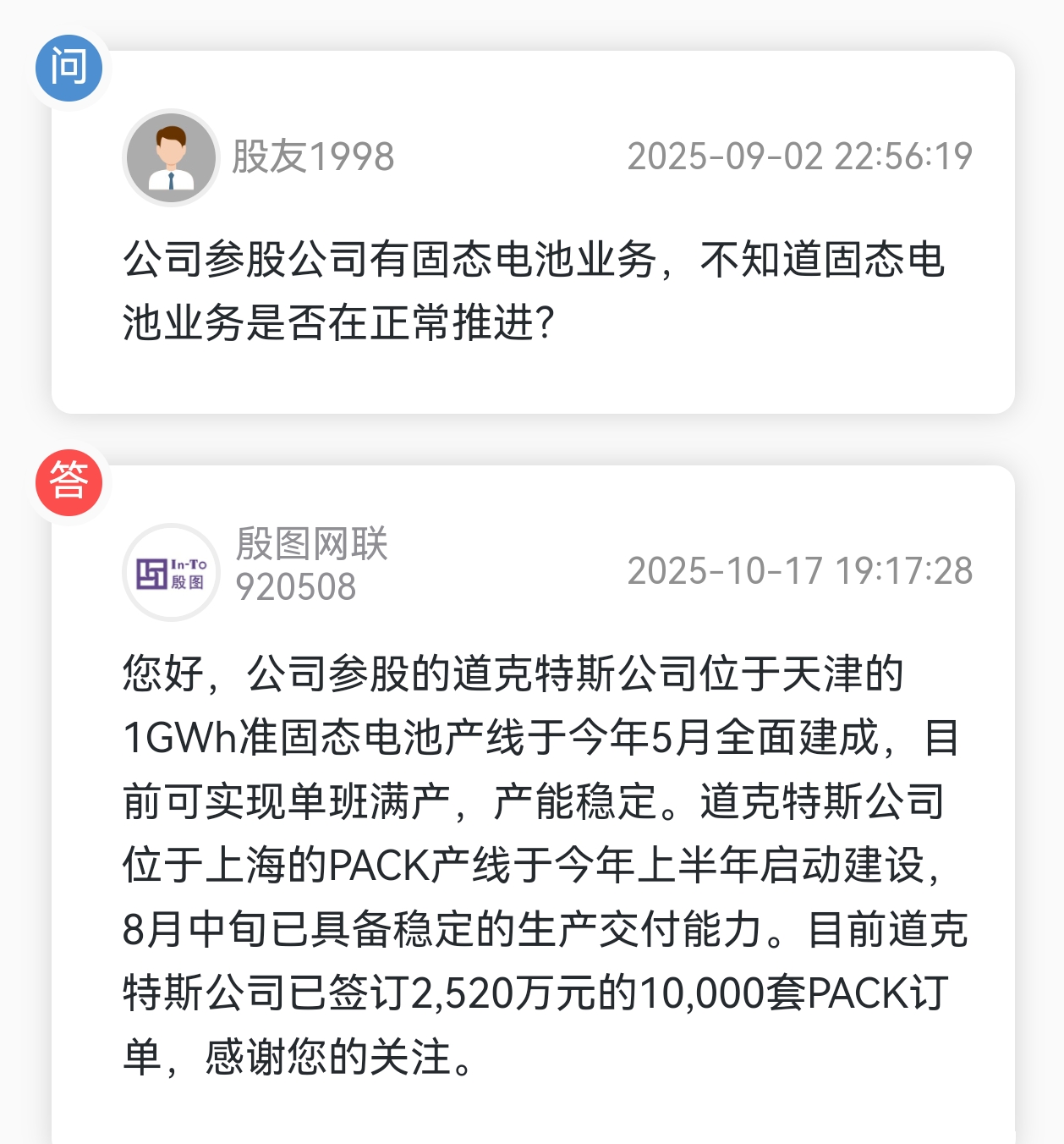 $殷图网联(SZ920508)$ 投资者互动显示: 殷图网联参股的固态电池公司道克特斯1GW固态电池生产线已建成,已接10000套PACK订单!
