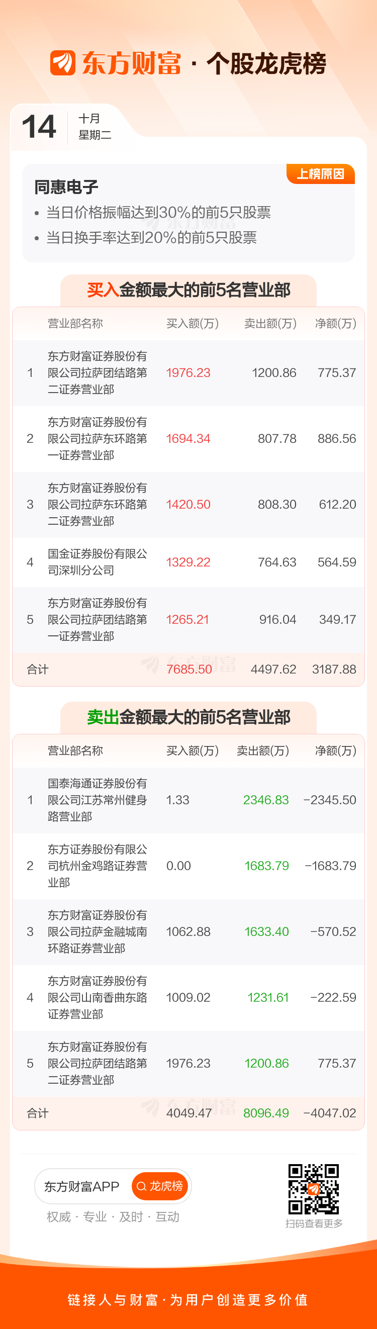交易所2025年10月14日公布的交易公开信息显示,同惠电子因成为当日价格振幅达到30%的前5只股票、当日换手率达到20%的前5只股票上榜。同惠电子当日收报47.77元,涨跌幅8.15%,偏离值36.33%,换手率25.86%,成交额10.10亿。