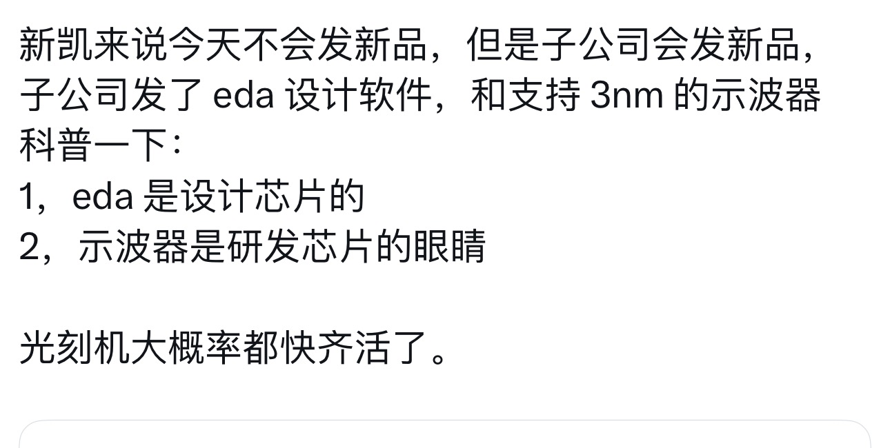 新凯来说今天不会发新品,但是子公司会发新品,子公司发了eda设计软件,和支持3n