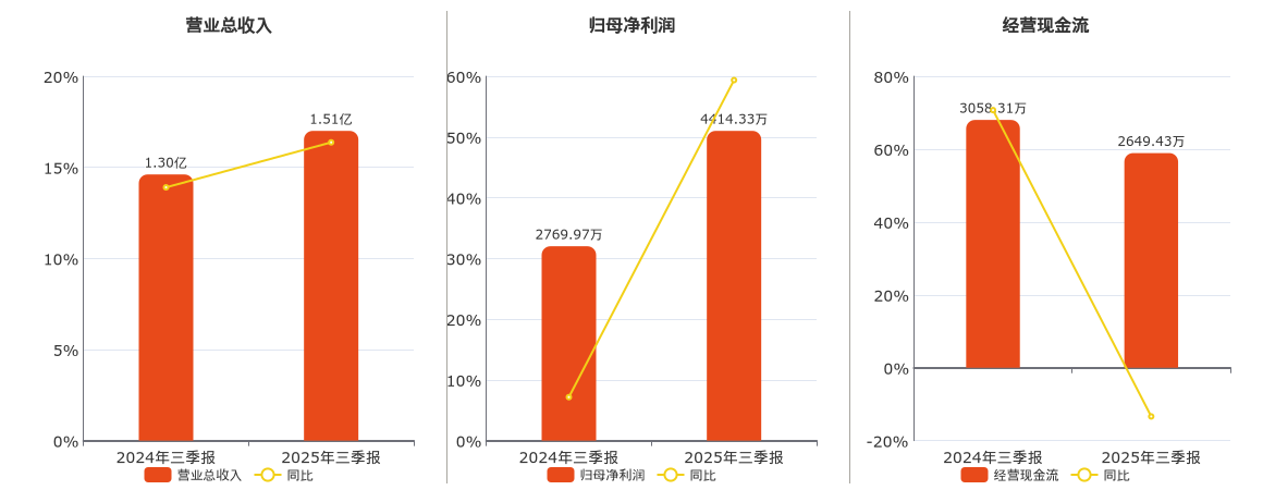 公司营业总收入为1.51亿元,在已披露的同业公司中排名第145。归母净利润为4414.33万元,在已披露的同业公司中排名第87。经营活动现金净流入为2649.43万元,在已披露的同业公司中排名第81,较去年同报告期经营活动现金净流入减少408.89万元,同比较去年同期下降13.37%。