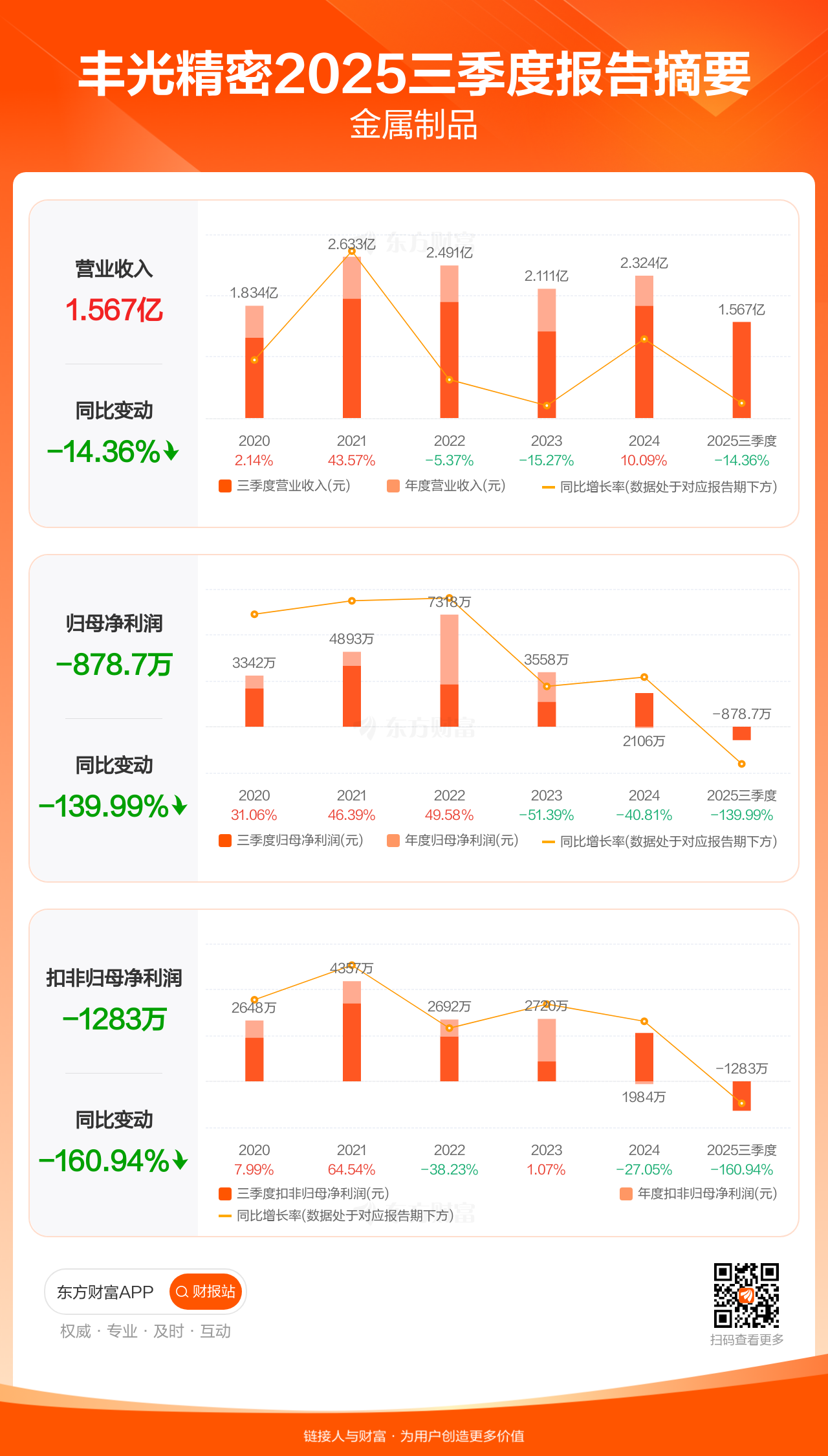 丰光精密10月29日发布2025年三季报显示,公司前三季实现营业收入1.57亿元,同比下滑14.36%;归母净利润-878.67万元;扣非归母净利润-1283.39万元。