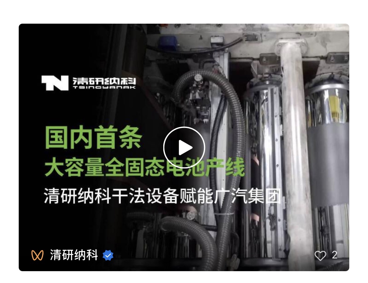 近日, 央视新闻重点报道了广汽集团国内首条大容量全固态电池产线建成并进入小批量测试阶段,在行业内率先具备了60安时以上车规级全固态电池的批量量产条件,标志着全固态电池技术里程碑式的突破。而撑起这条产线的关键设备,正是由清研纳科交付并投入使用的高速宽幅(固态)干法电极设备。