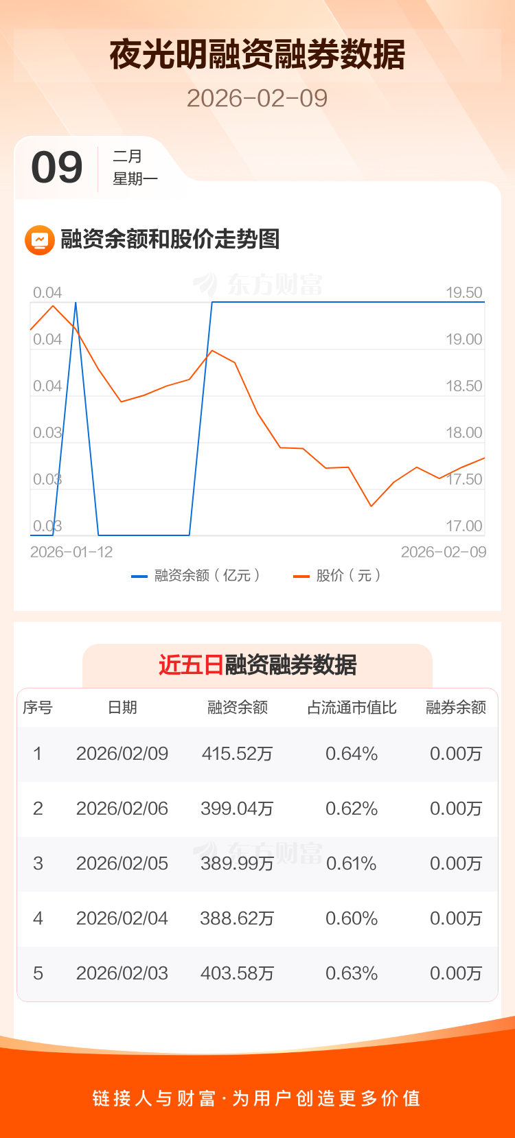 交易所最新数据显示,夜光明于2026年2月9日获融资买入46.79万元,融资偿还30.31万元,当日融资净买入16.48万元。目前,该股融资余额415.52万,占流通市值比例为0.64%。
